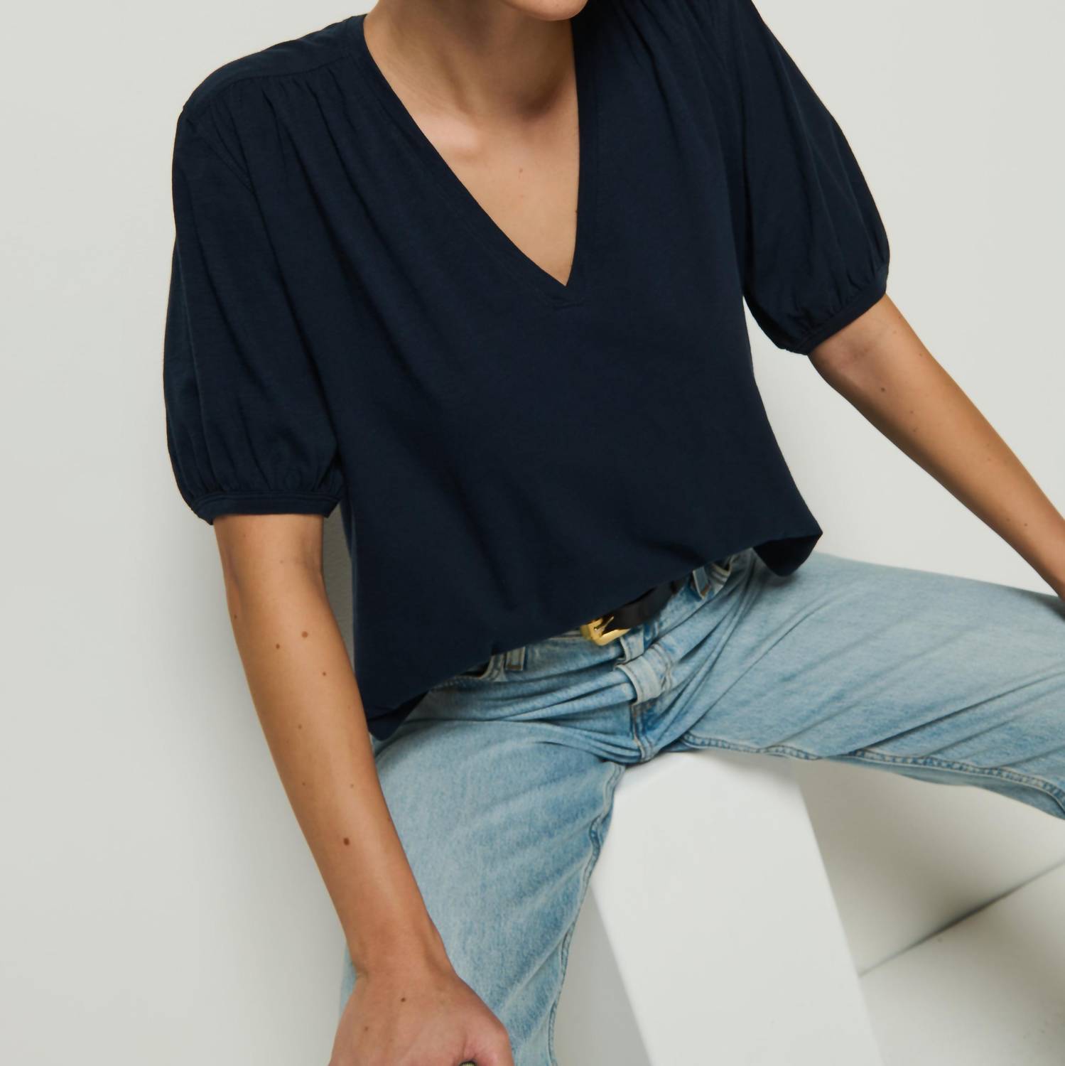 Meet the Edie Shirred Shoulder Top from Nation LTD, an ultra-chic update to a classic tee. This Night Sky blouse features short cuffed balloon sleeves, a stylish V-neckline, and striking shirring details at the shoulders and smocked yoke for added drama. Crafted from 100% Peruvian Cotton, it offers a soft and smooth touch with a cozy loop pile. Originating from Peru, this pull-on style is effortless to wear and maintains its look by washing in a machine and laying flat to dry.