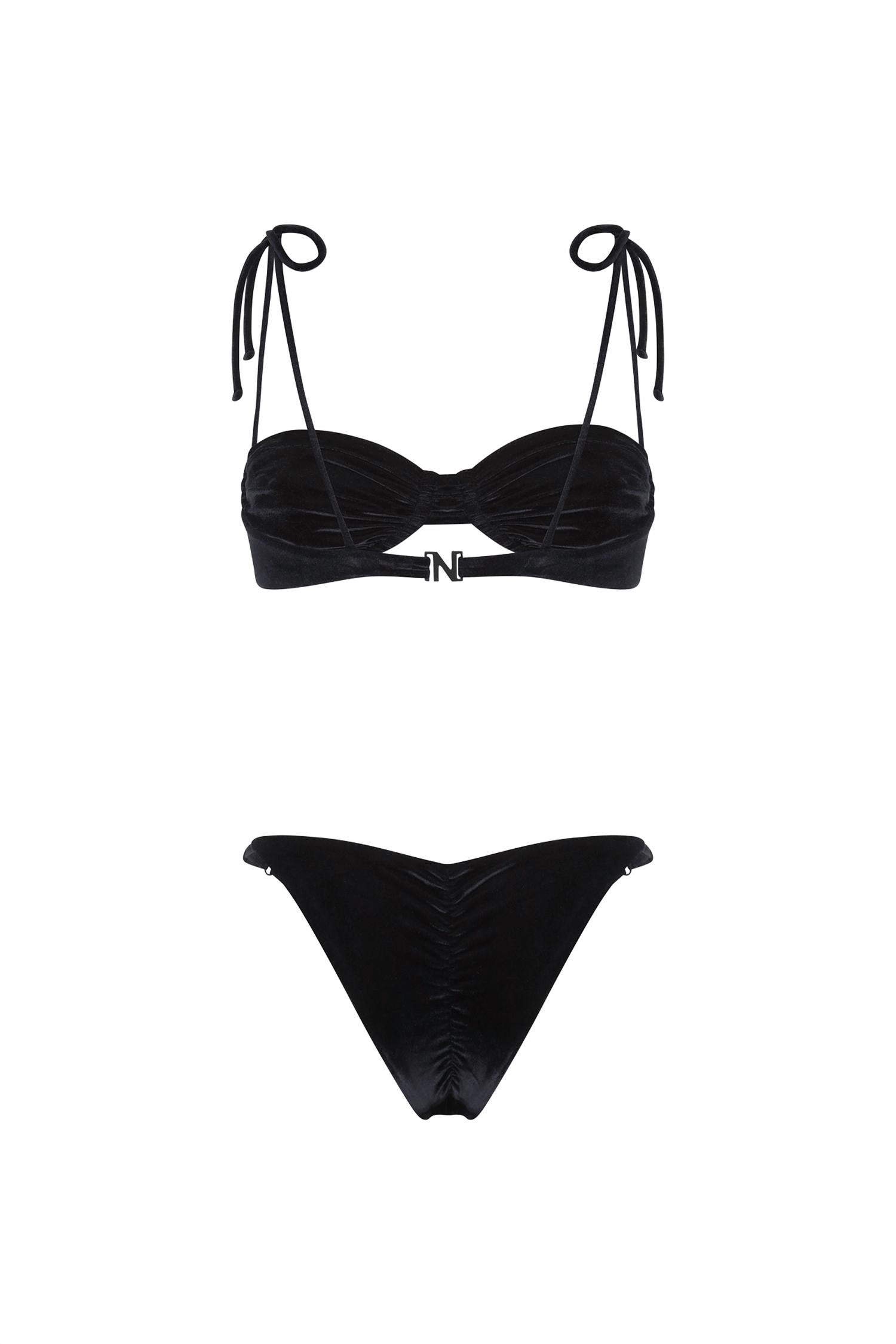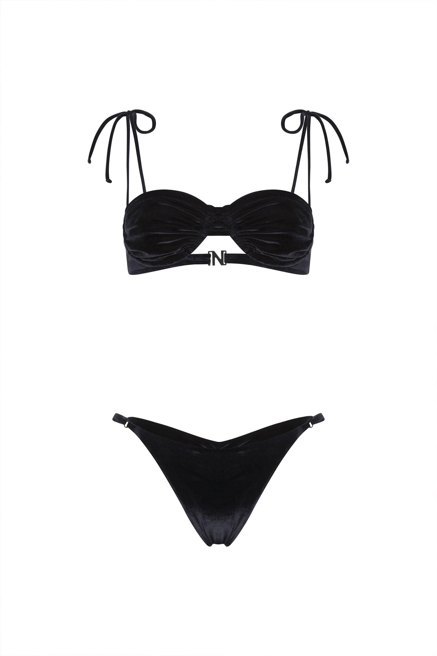 This cute and flattering swimsuit is perfect for making a splash at the pool, lounging on sun-kissed beaches, and staying stylish throughout the upcoming summer season. Introducing the Esencia Brassiere-like Bikini Top And Bottom Set by Nelblu, designed in a luxurious Black Velvet shade. This swim set pairs a bralette-style top with spaghetti straps and a cheeky, ruched-back low-rise bikini bottom, perfectly suited for a stylish beach day. Origin: Not specified. Care: Wash with cold water and mild detergent; avoid fabric softeners and direct sun exposure for lasting quality.