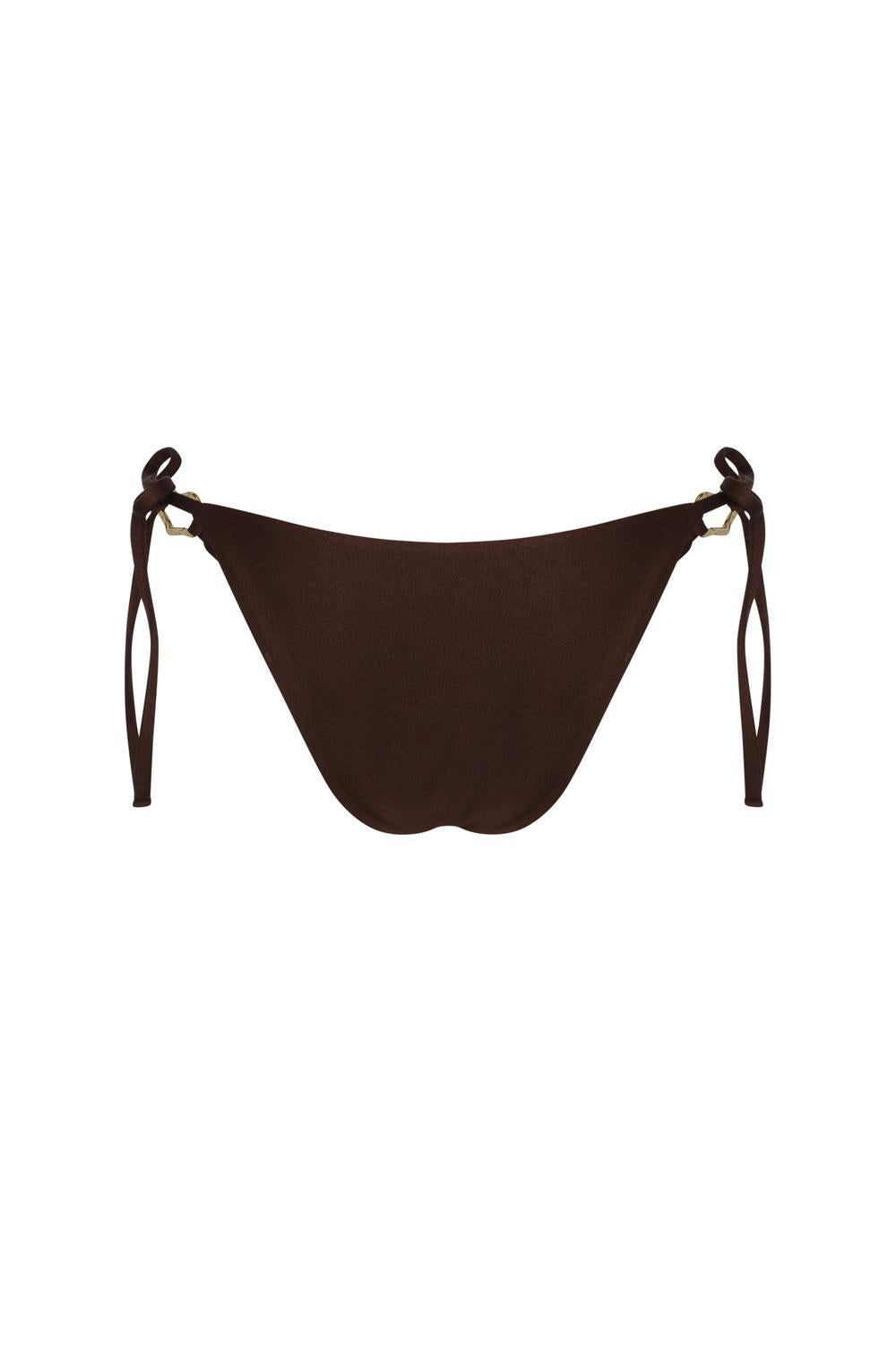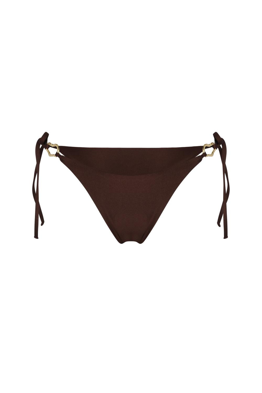 Dream of your next beach getaway in this cute little number. Pair with strappy sandals, a floppy hat, and an oversized tote to complete the perfect vacation look. Introducing the Nelblu Petalo Side Tie Cheeky Bikini Bottom in a rich chocolate hue, perfect for a stylish beach day. This low-rise string bikini features elegant organic-shaped gold hardware on both sides, offering a sophisticated flair. Country of origin is unspecified. To maintain its quality, rinse immediately upon contact with sunscreen, oils, or chlorine, avoid fabric softeners, and do not tumble dry, bleach, or iron.