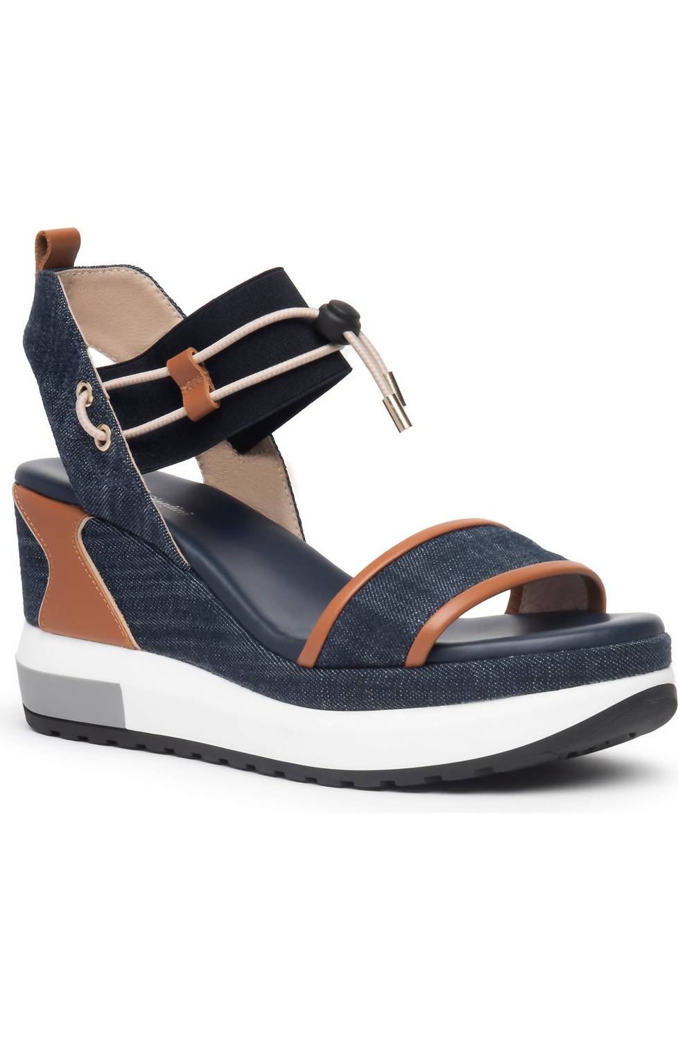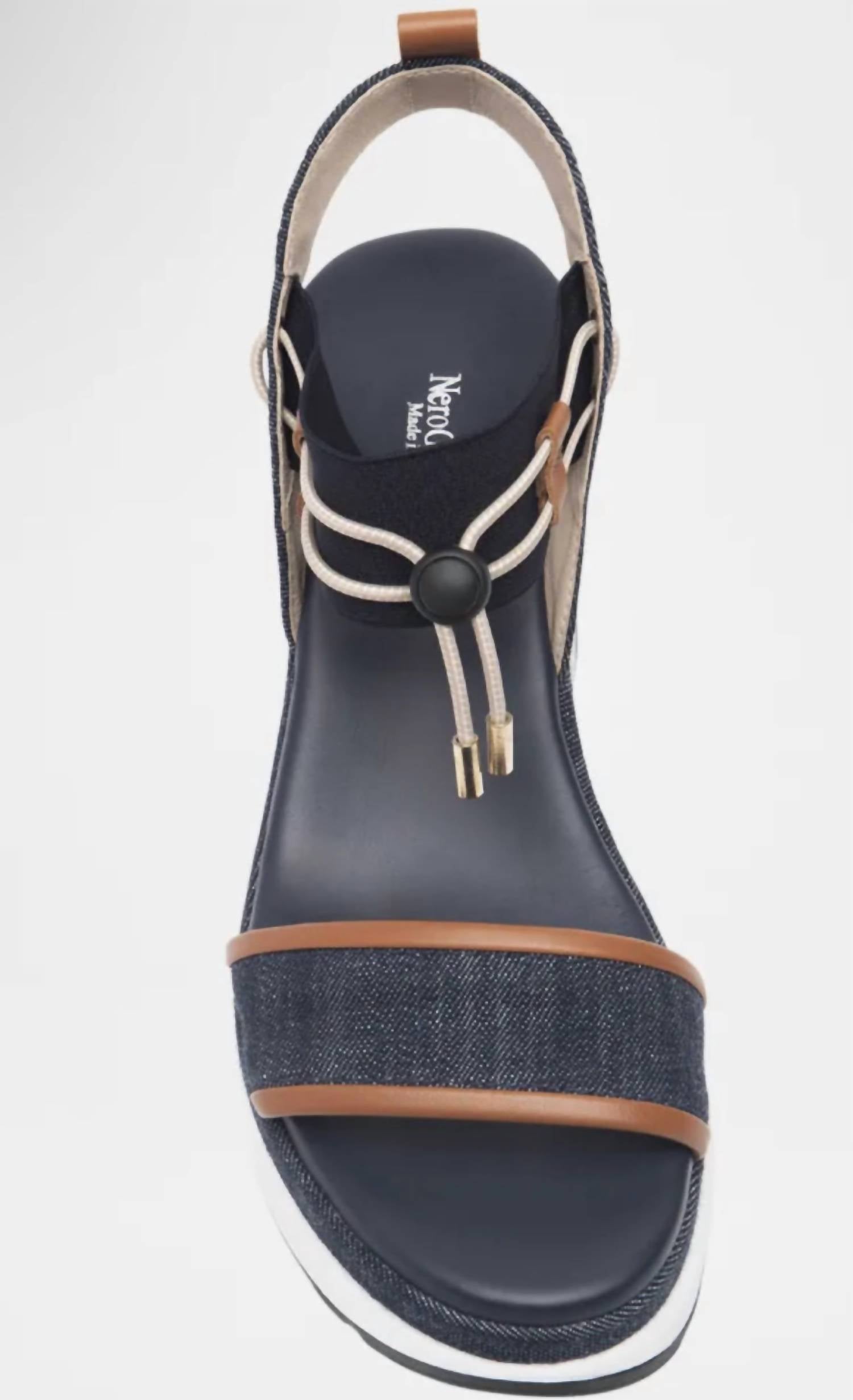 Timeless wedges that will be relevant season after season. Step up your style with the Women's Bungee Platform Wedge by NeroGiardini, expertly crafted in Italy. These sandals feature an eye-catching combination of denim and leather with mesh straps, set on a striking 3.15-inch wedge heel. They offer an adjustable bungee cord ankle strap for a secure fit and are completed with an open toe design and a durable polyurethane outsole. Composition includes a textile and leather upper, with leather lining, requiring spot clean care for lasting elegance.