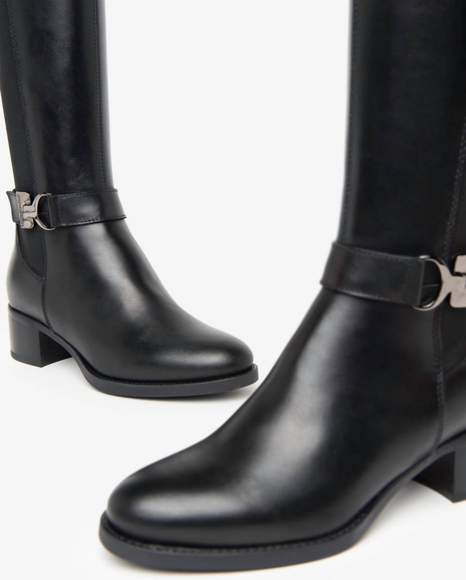 These over the knee boots are equal parts classic and cool. Embrace the quiet luxury of the Women's Leather Stretch Buckle Knee Boots by NeroGiardini, perfect for your next evening event. These over-the-knee boots feature a sleek black color with a round toe and are constructed from premium leather and stretch fabric, providing both elegance and comfort. A stylish buckle ankle strap adds a touch of sophistication, while a 1.5-inch block heel offers low yet chic elevation. Experience a pull-on style made with an outer shell of leather and technical fabric, complemented by an inner lining of leather and canvas and a durable rubber sole.