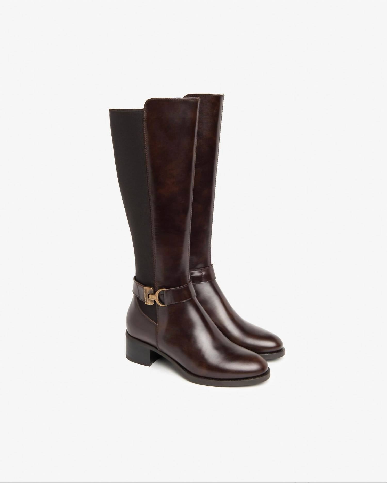 Discover the Women's Leather Stretch Buckle Knee Boots by NeroGiardini, a perfect blend of luxury and practicality. Designed with a knee-high length and crafted from premium leather and technical fabric for a chic brown finish, these boots offer a stylish almond toe and a compact 1.5" block heel for added comfort. The elegant buckle ankle strap enhances the look, and the pull-on style ensures ease of wearing. Ideal for evening events or seasonal transitions, these boots embody the quiet luxury trend effortlessly.