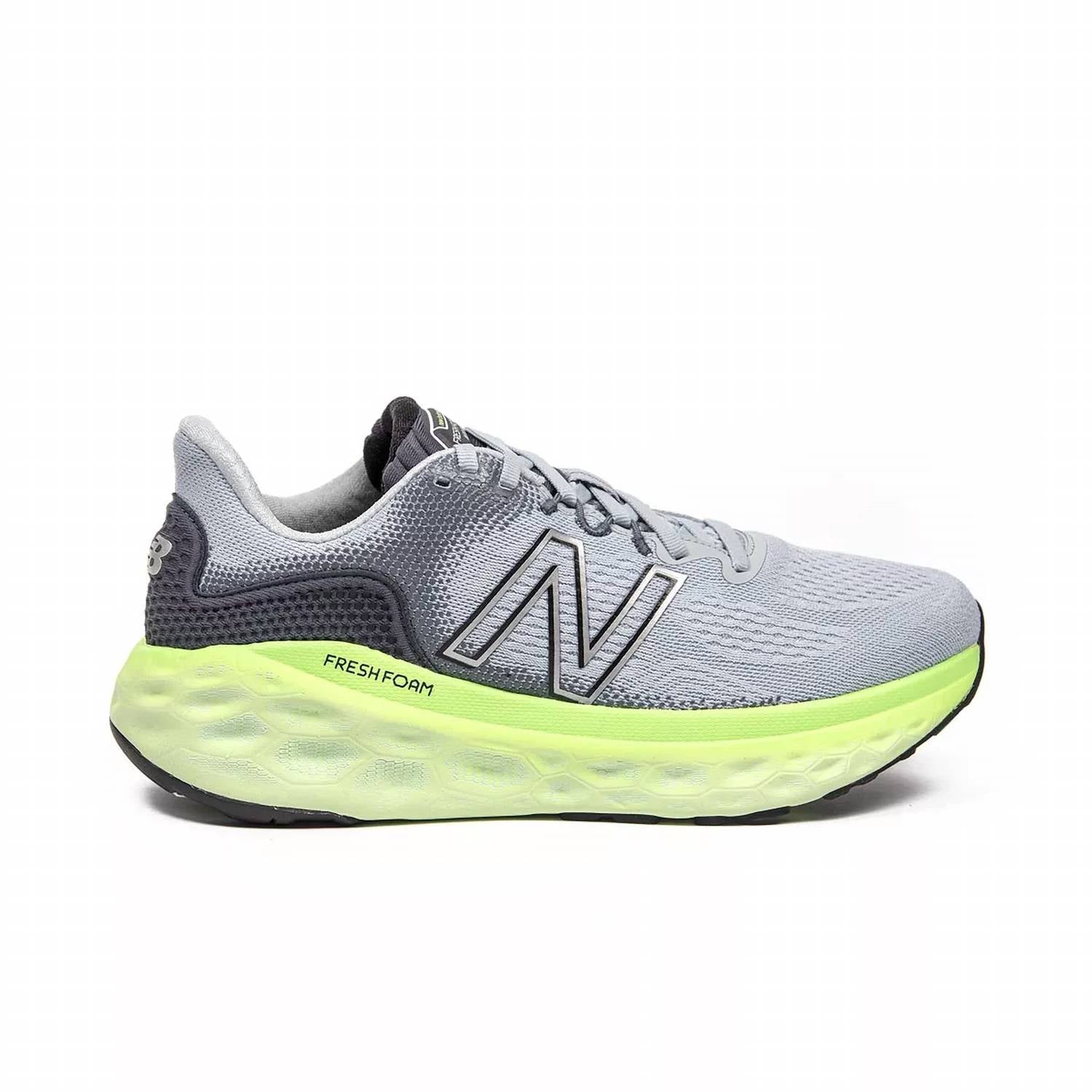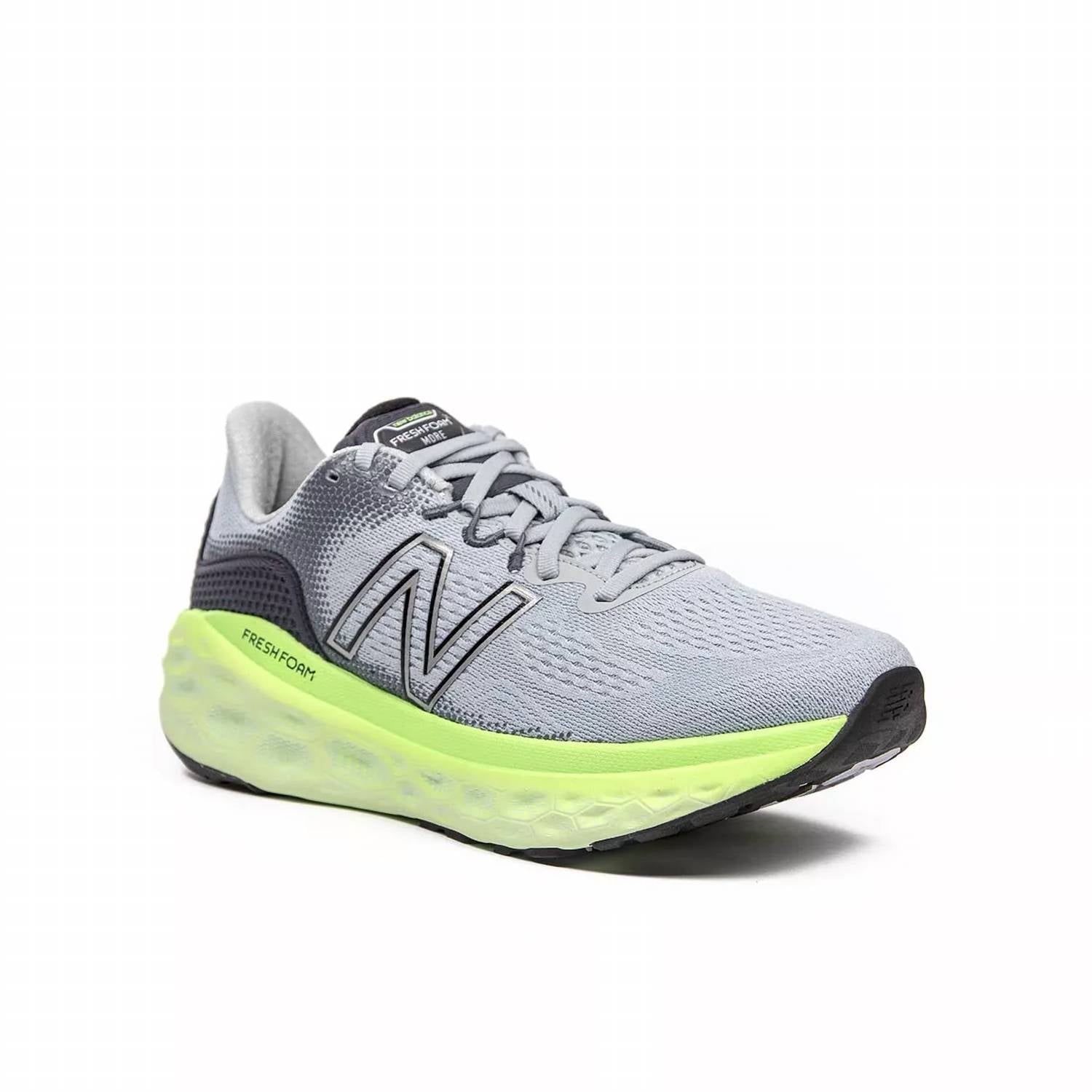 Introducing the Men's Fresh Foam X More V3 Running Shoes by New Balance, showcasing a lightweight design in Light Slate and Vibrant Spring. These neutral athletic shoes feature a plush Fresh Foam midsole, enhancing comfort for long runs or workdays. The shoe is crafted with a soft engineered mesh upper for optimal breathability and incorporates a unique outsole design for improved traction. Ideal for everyday training on the road, it weighs 10.9 oz (M) with a 4mm drop, featuring a round toe and medium width, perfect for those embracing the athleisure trend.