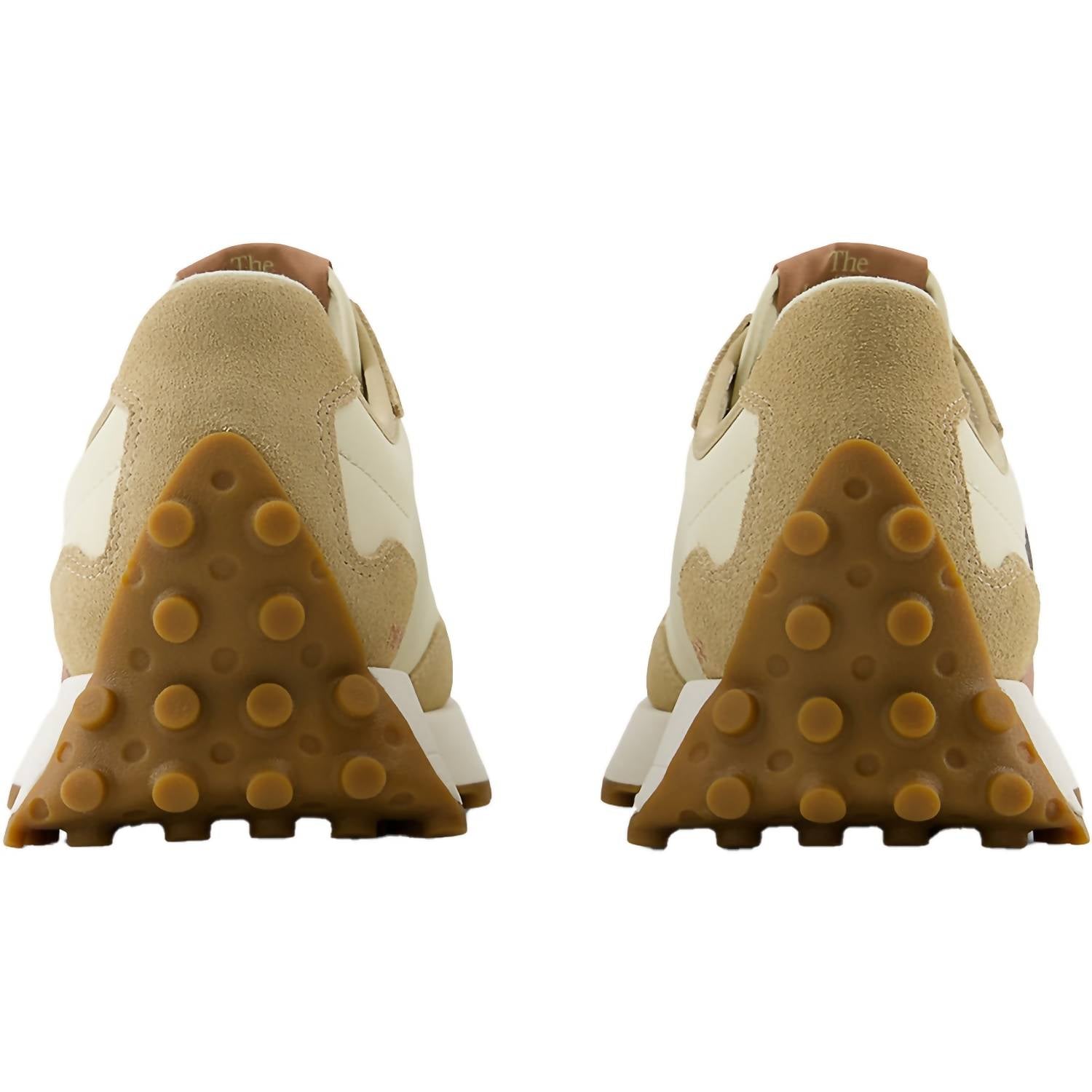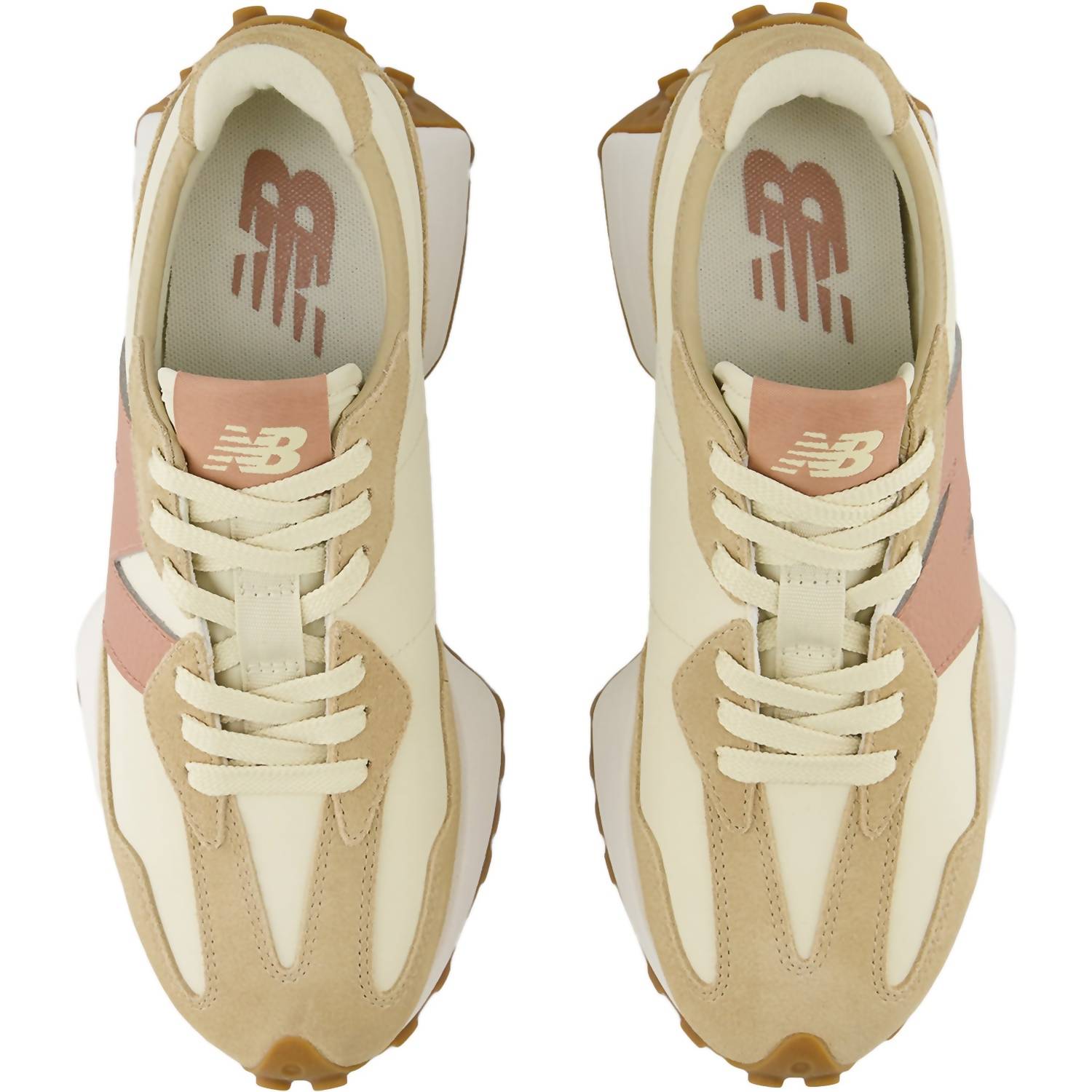 Workout in style with these adorable athletic sneakers. The New Balance 327 Women's Running Shoes offer a stylish fusion of 1970s retro charm and modern-day athletic flair. Made with a suede and nylon upper in a chic beige, these sneakers feature textured accents and an oversized logo for a nod to classic style. Designed with a lace-up closure for a custom fit, a cushioned footbed ensures all-day wearability, while a rubber outsole provides a non-slip grip. Perfect for summer and athleisure trends, these flat heel shoes with a round toe are ideal for travel and casual outings.