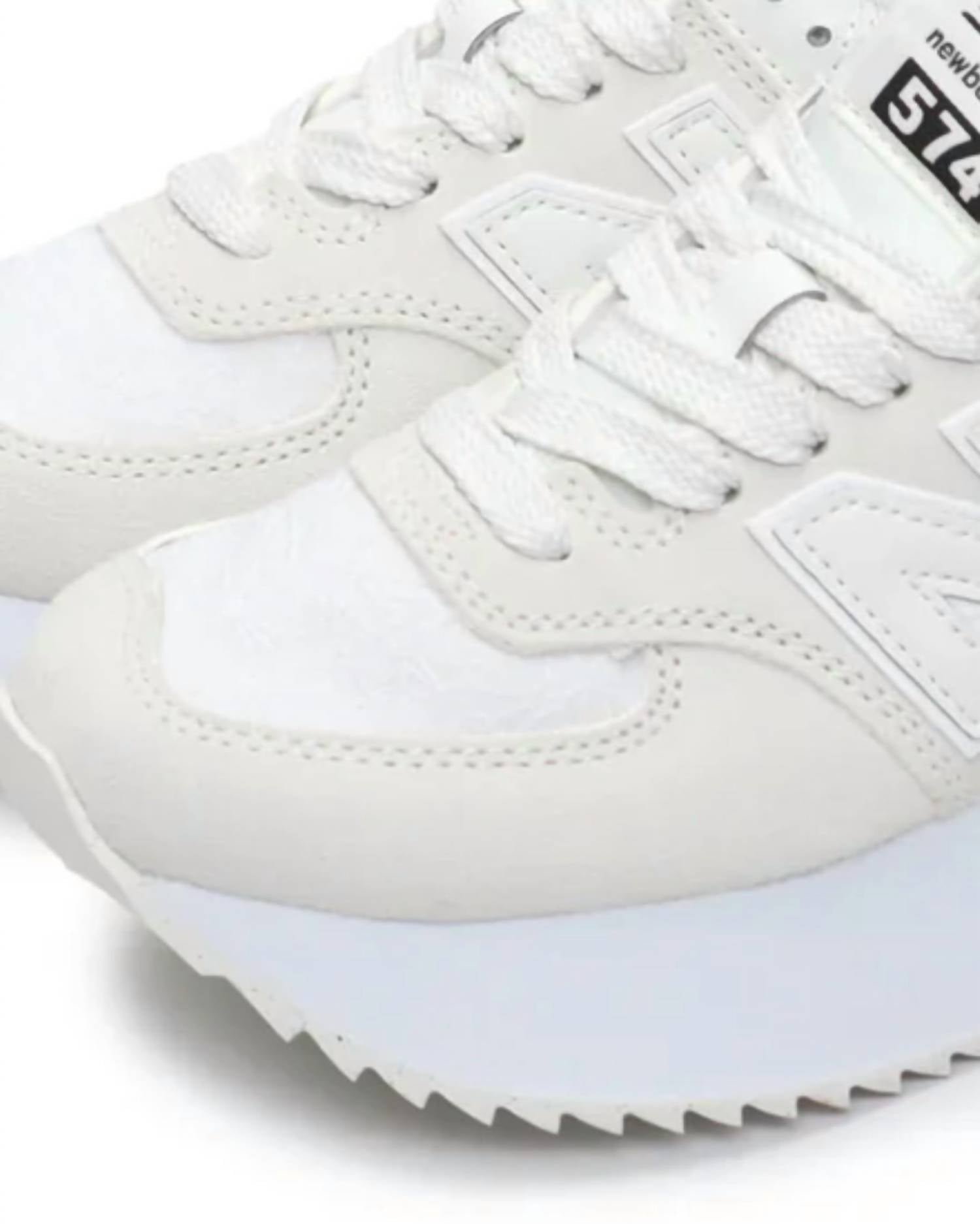Discover the New Balance Women's WL574ZBJ+ Sneakers in a chic white hue, perfect for a timeless yet minimalist appeal. Crafted from mesh material with premium pigskin suede overlays for added style, these sneakers provide unmatched comfort through their ENCAP midsole cushioning and two-piece, die-cut EVA midsole. They feature a ripple outsole, flat heel, and a round toe shape, making them ideal for summer travel occasions. With a 37mm midsole height and weighing 282 grams (9.9 oz), these sneakers promise both style and reliable performance.