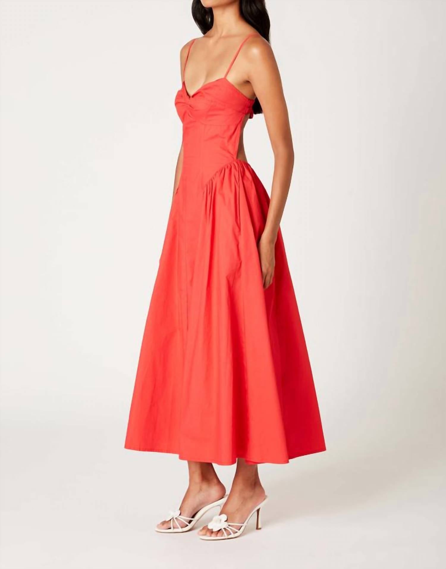 The perfect length dress does exist. Step into style with the Destene Dress by NIA, a standout piece in a vibrant cherry hue. This charming midi dress is crafted from comfortable cotton and features spaghetti straps and an A-line silhouette. Tailored for a playful and confident look, it's perfect for summer occasions and vacations. With its minimalist design, the Destene Dress incorporates a sweetheart neckline, ensuring you look chic and effortlessly elegant. Closure: Tie closure.