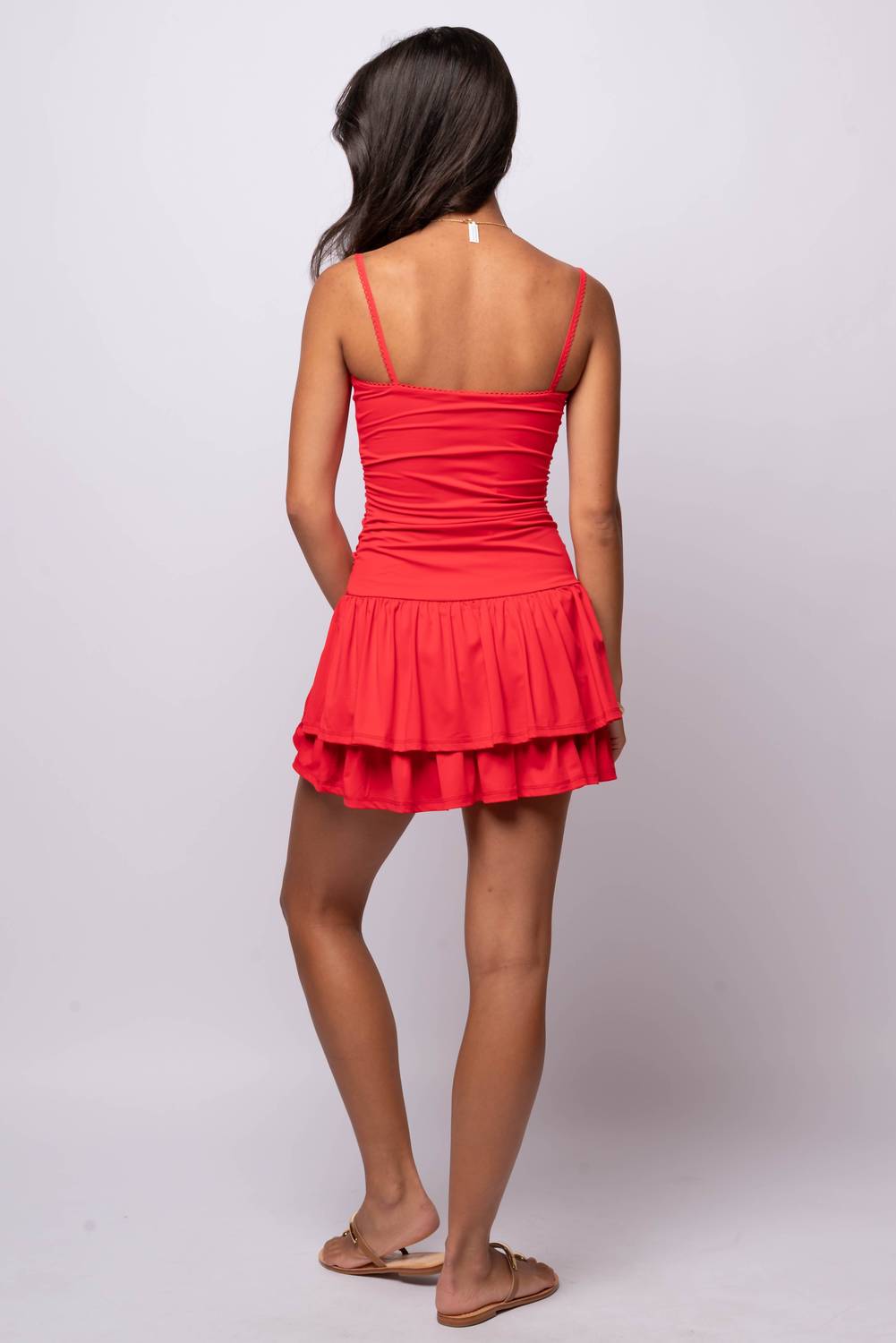 Introducing the Toto Mini Dress by NIA, a chic addition in vibrant Cherry Red, exuding dainty charm with its delicate lace-trimmed straps and sweet bow accent. This sleeveless, fit-and-flare silhouette features subtle ruching on the bodice paired with a tiered ruffle skirt for a playful flow. Crafted from 87% Nylon and 13% Spandex, this imported piece requires simple maintenance with hand washing. Designed with a pull-on closure, this dress is perfect for your next Thanksgiving dinner party or any summer occasion. Model Cooper, standing at 5ft 4 inches with a bust of 32”, waist of 24”, and hips of 28”, showcases a size x-small.
