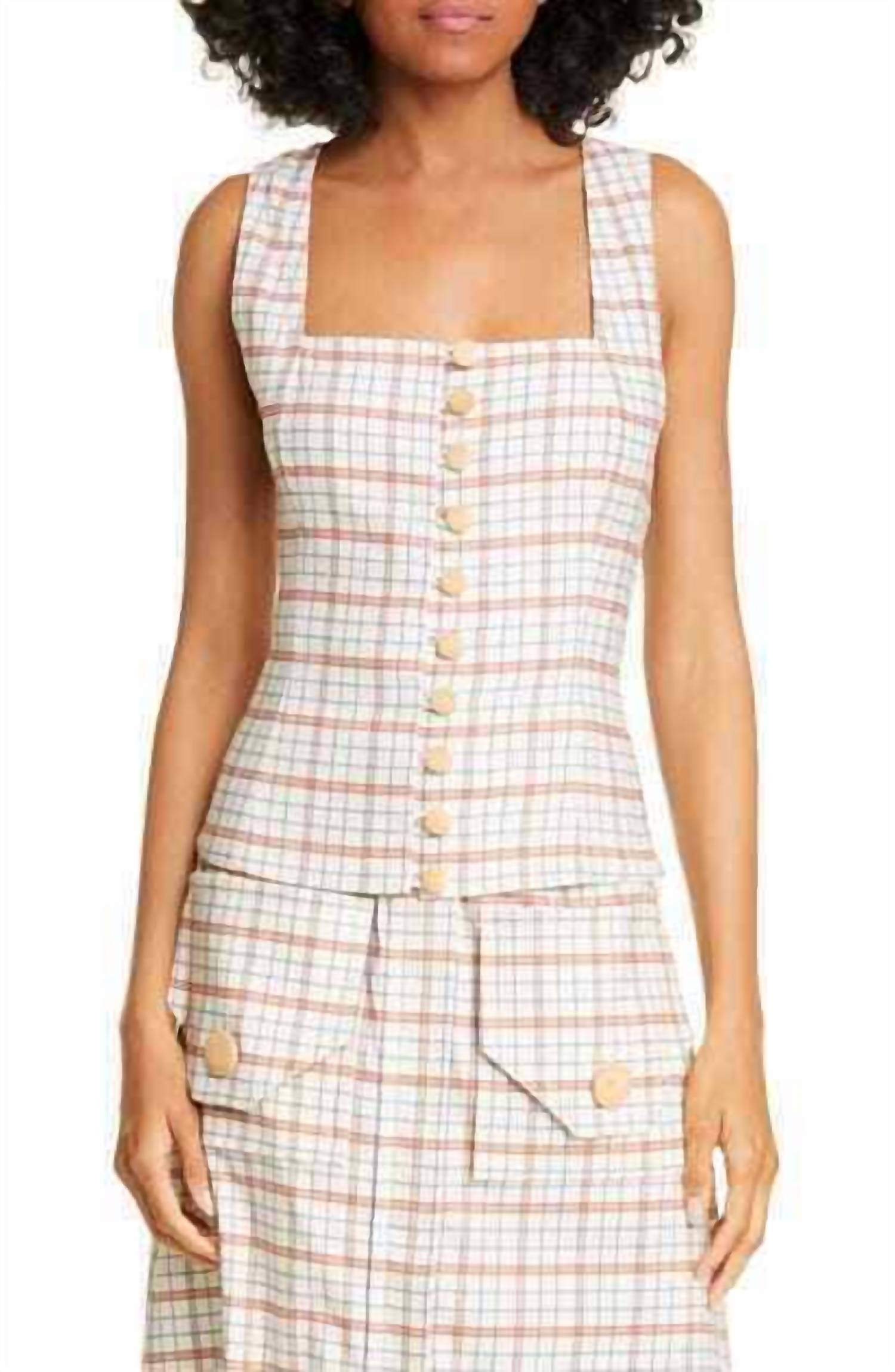 The perfect tank top for those warmer weather seasons. Introducing the Square Neck Button Front Pinafore Plaid Tank Top by NICHOLAS, a vibrant addition to any wardrobe. This sleeveless top combines a crisp plaid design with a cutting-edge crossover back for a contemporary twist on a classic look. Expertly crafted from 50% Tencel® lyocell, 47% linen, and 3% elastane, it ensures a comfortable and structured fit. Featuring a front button closure, the top measures 22.5" in length with a chest of 20.5" and a waist of 21". Care for this piece through dry cleaning to maintain its superb quality.