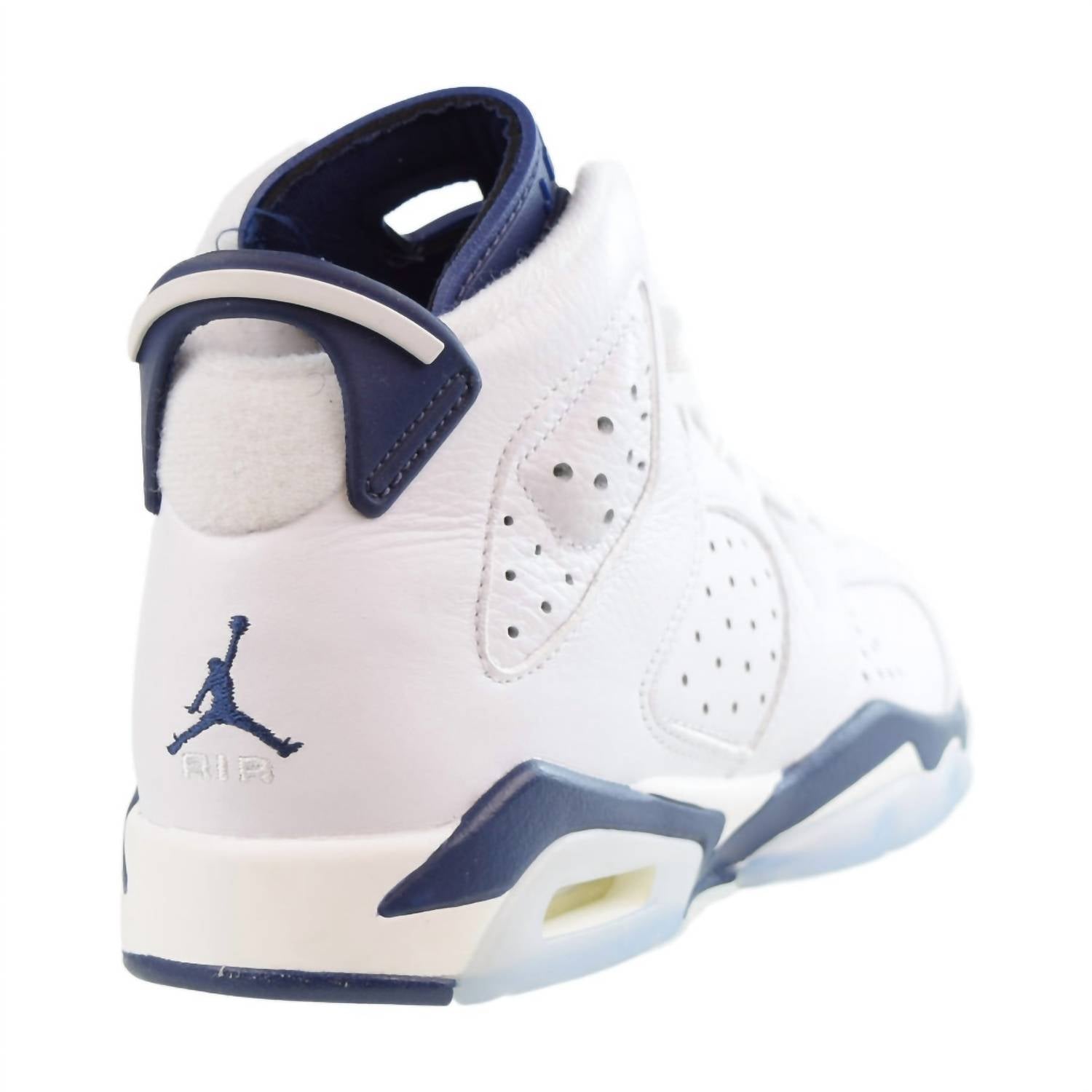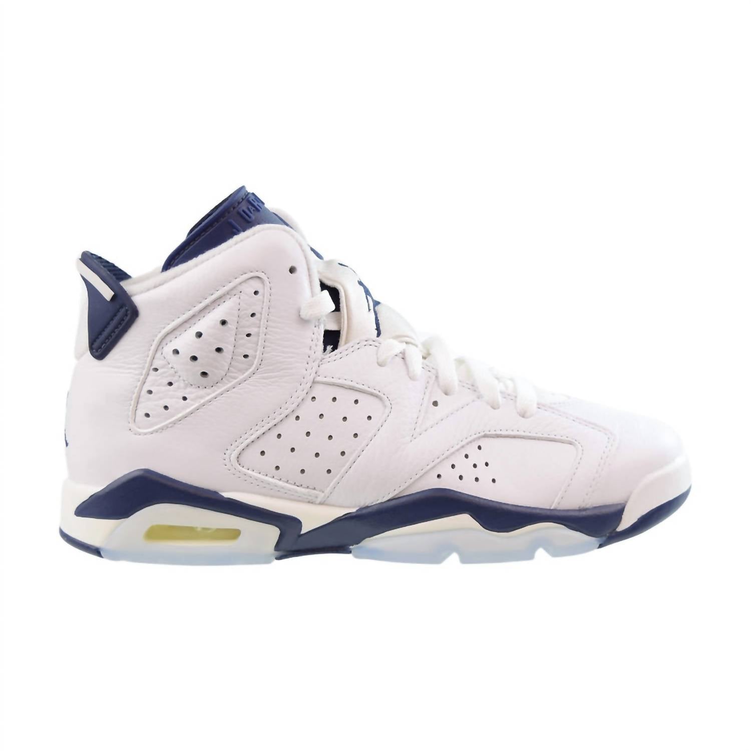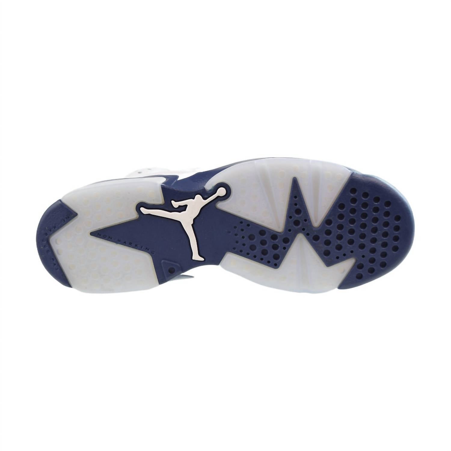 The Air Jordan 6 Retro by Nike is a classic sneaker designed for big kids who appreciate iconic basketball footwear. This shoe, in a White/Midnight Navy colorway, features a premium upper with Air Jordan styling, enhanced breathability through perforation, and an Air-sole heel unit for comfortable cushioning. Constructed with durable leather, synthetic materials, and a rubber outsole, it also includes a reinforced toe area for added protection. Style number 384665-141, it’s perfect for back-to-school and streetwear trends.