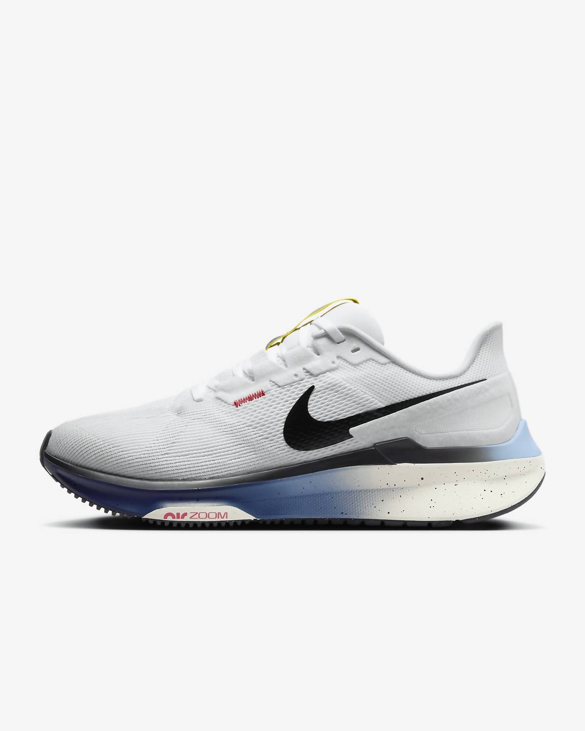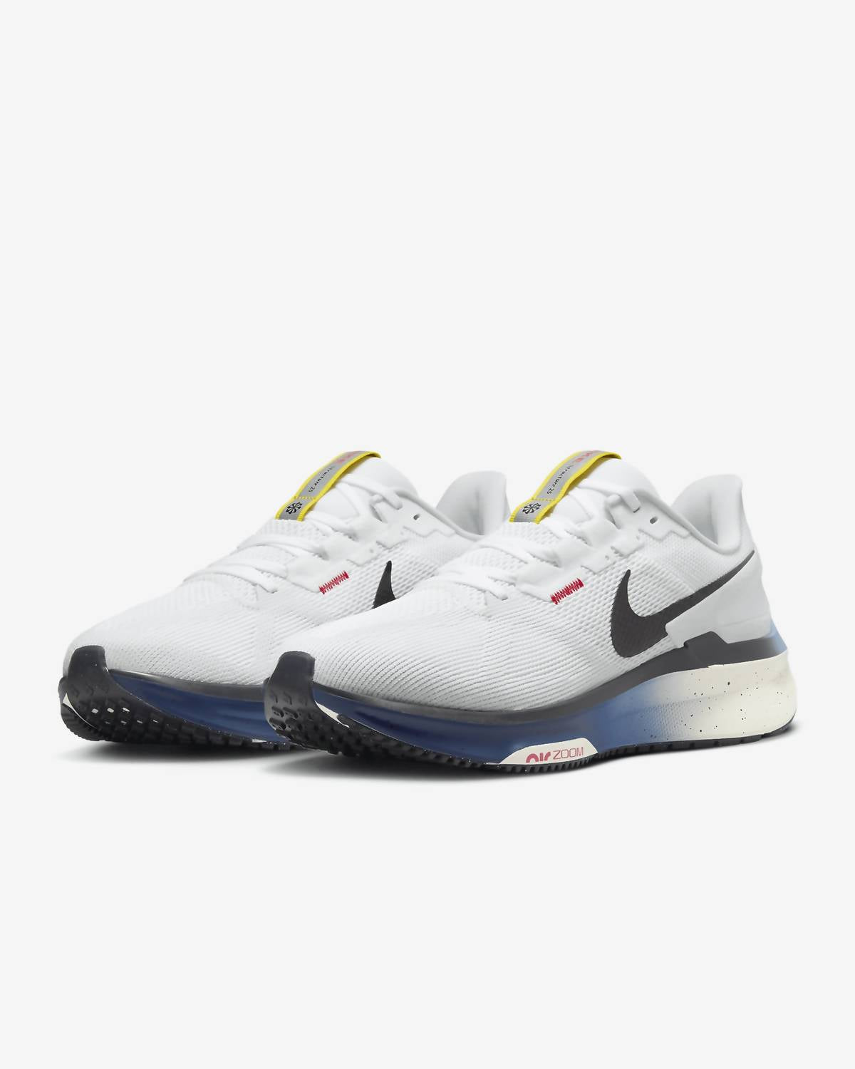 Introducing the NIKE Air Zoom Structure 25 Road Running Shoes, expertly designed for men seeking both style and support during their summer training. These athletic shoes, showcased in a vibrant White, Speed Yellow, Speed Red, and Black combination, feature a round toe and are perfect for game day. With a single-layer mesh for breathability, a fully supportive midfoot system, and more cushioning for comfort on long runs, these shoes deliver on performance. They weigh approximately 11.4 oz (322 g) in a men's size 10, have a 10 mm heel-to-toe drop, and include reflective details for added visibility.