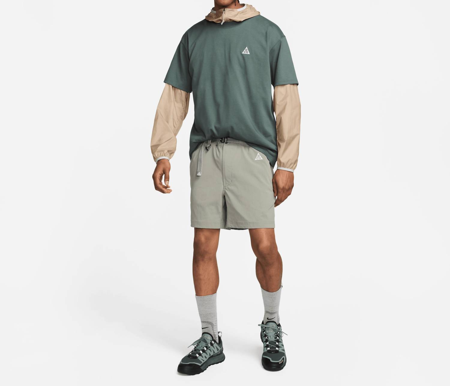 Explore the outdoors with the Nike Men's ACG Shorts in Dark Stucco/Summit White. Crafted for adventure, these hiking shorts feature a stretchy nylon blend composition, offering water-repellent woven fabric to keep you dry. They're enhanced with a quick-release hook on a lightweight webbing belt for a tailored fit. Benefit from zippered utility pockets and a zippered back welt pocket for secure storage of essentials. Machine washable for your convenience. Imported.