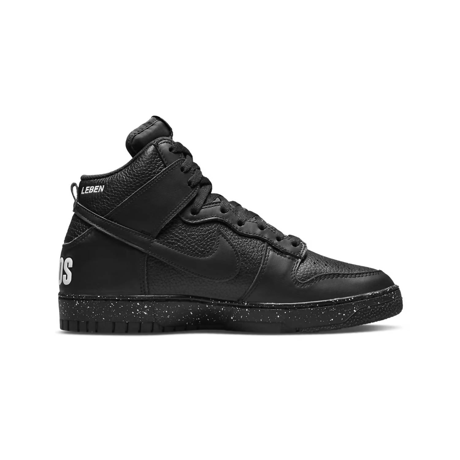 Genuine black leather takes over the upper while a smooth leather Swoosh accents the texture—all on top of a speckled midsole.