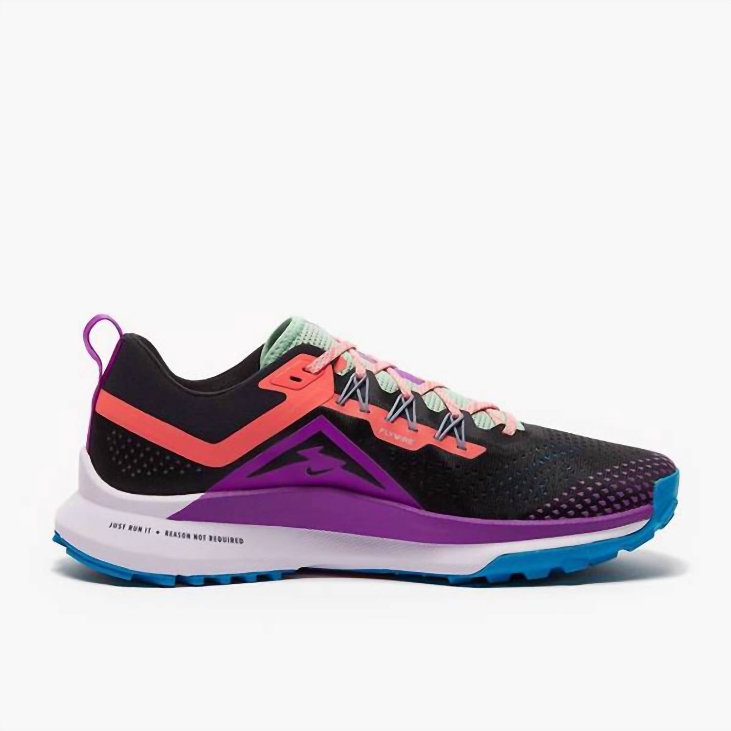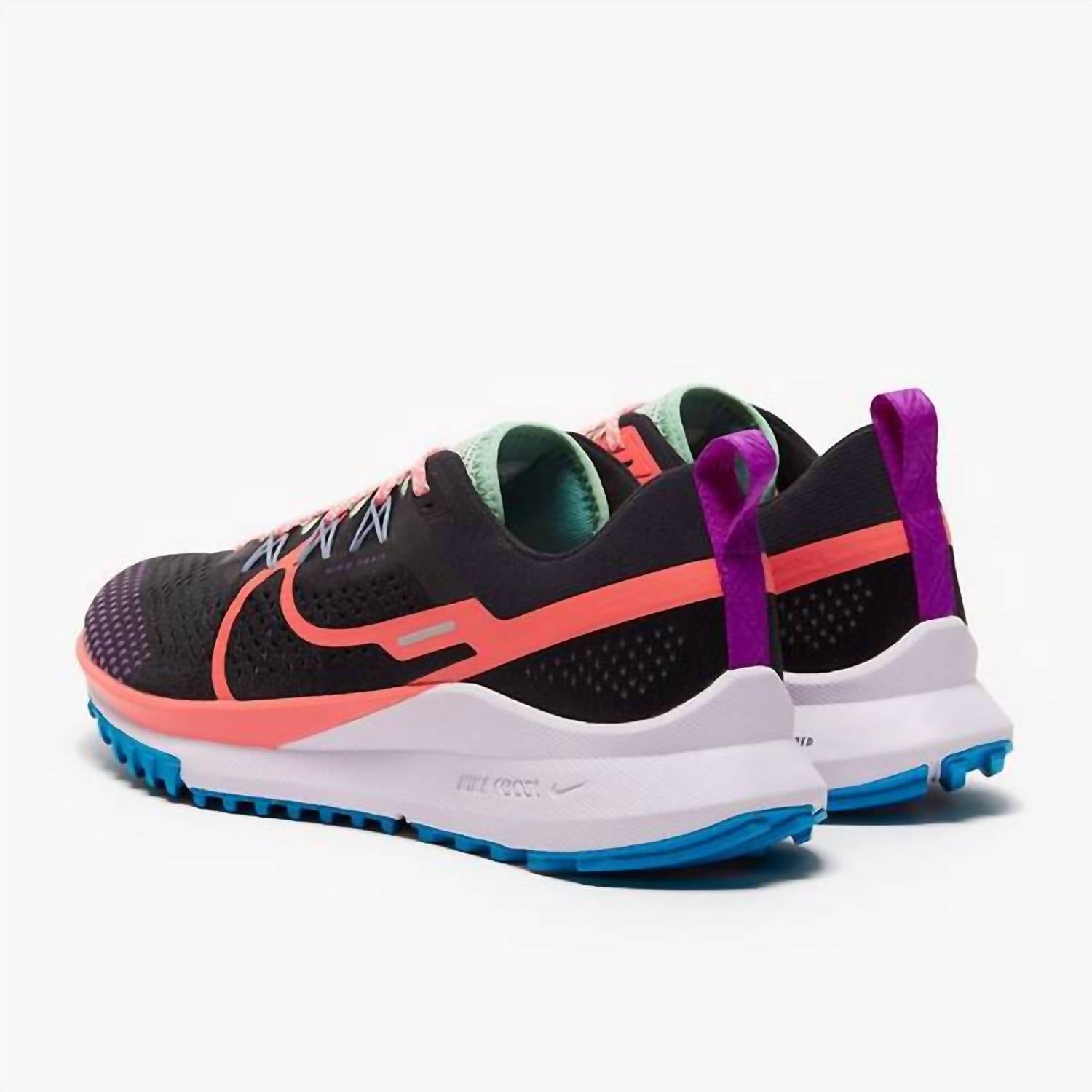 Introducing the Women's React Pegasus Trail 4 Sneaker by NIKE, a perfect blend of style and functionality in Black/Magic Ember-Purple. Crafted with a durable rubber material, these sneakers feature a comfortable round toe design. The low heel height ensures stability and ease throughout your day. Tailored for men, they provide a medium shoe width for a comfortable fit.