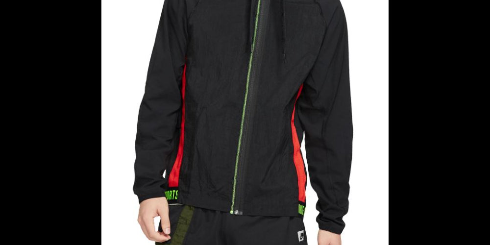 Drawstring hood; zipper closure at front|Flex fabric moves with you; Dri-FIT wicking technology helps evaporate moisture; mesh panels at sides; repeat logos at back|Pockets at front|Shell, mesh: nylon|Machine washable|Imported