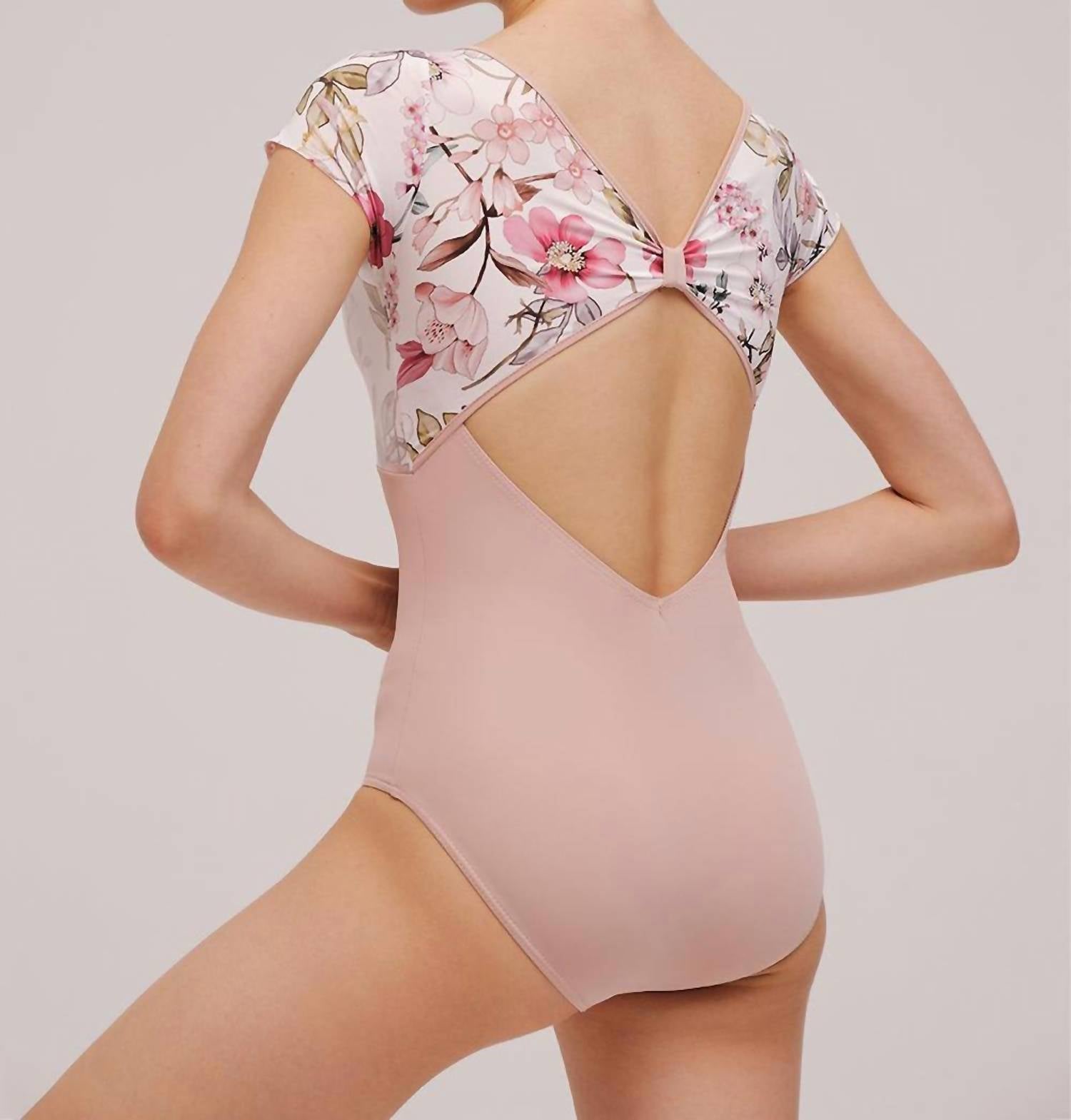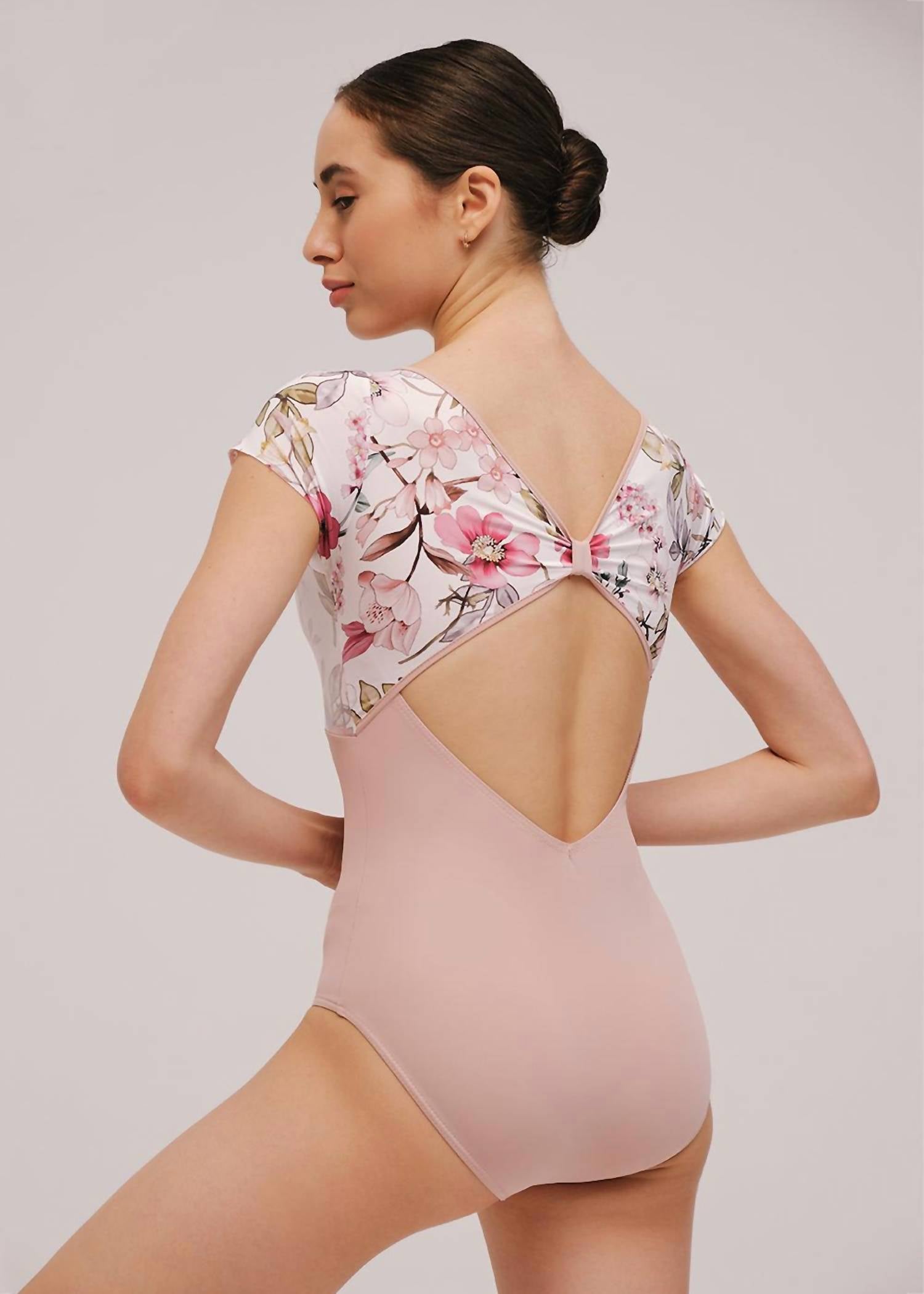 Meet the Remi Cap Sleeve Leotard by Nikolay, a stunning addition to your wardrobe in a delicate Tea Rose hue. It features graceful cap sleeves and a scoopneck design, with a sheer mesh bust overlay that proudly displays its fresh floral print. This elegant bodysuit offers a pull-on closure for ease of wear and is perfect for the spring season. Designed specifically for women, it beautifully highlights your curves with a low V-shaped back below a diamond keyhole.