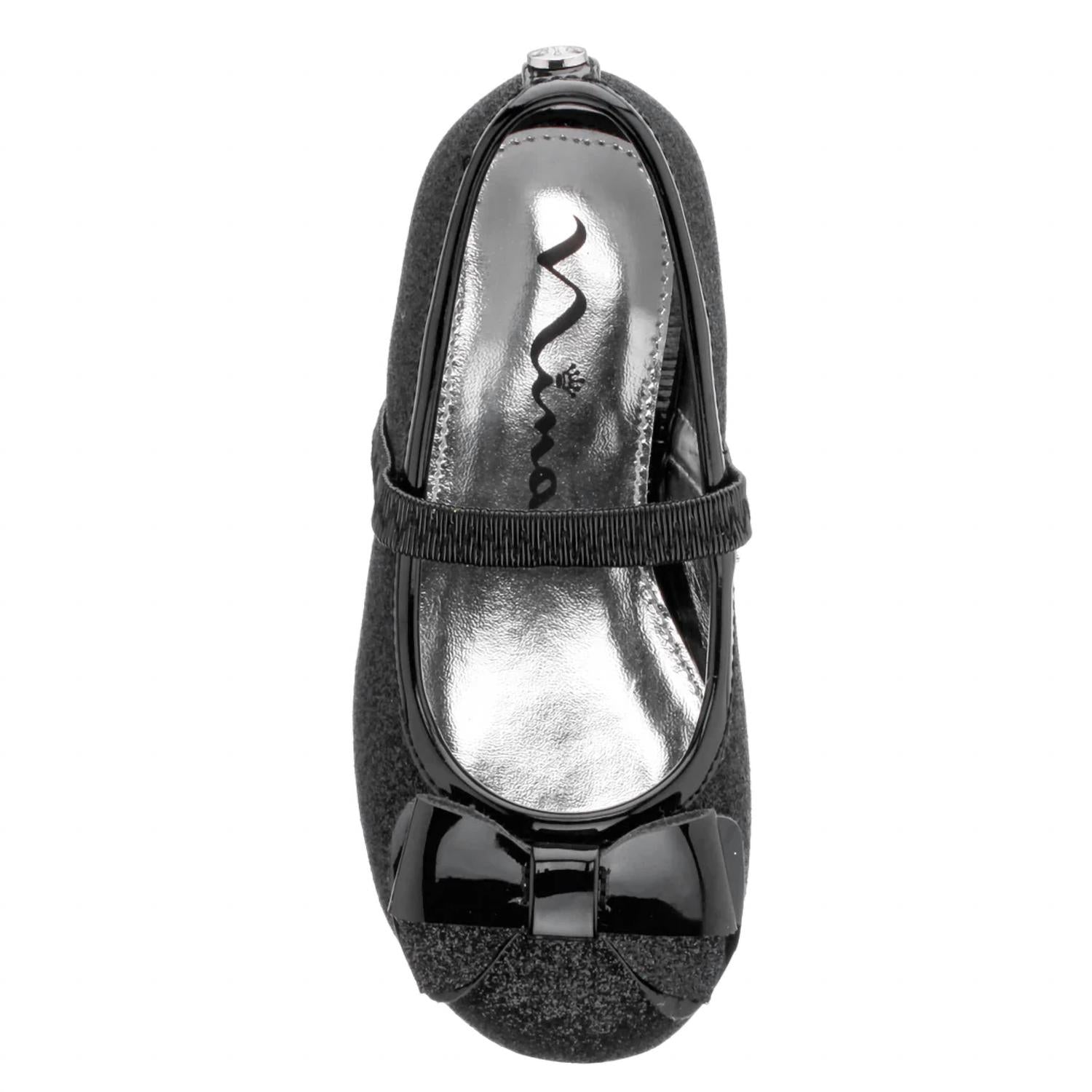 Elevate your toddler's style with the Kid's Kenzee Shoes by Nina, a must-have addition to any wardrobe in dazzling black. These ballet flats feature an eye-catching glitter and patent vegan leather composition, adorned with a charming decorative bow. They offer a cushioned memory foam insole and a flexible non-slip TPR outsole, ensuring comfort and safety with every step. Made with a man-made upper and lining material, this round toe, flat heel design is perfectly crafted for little girls' special occasions.