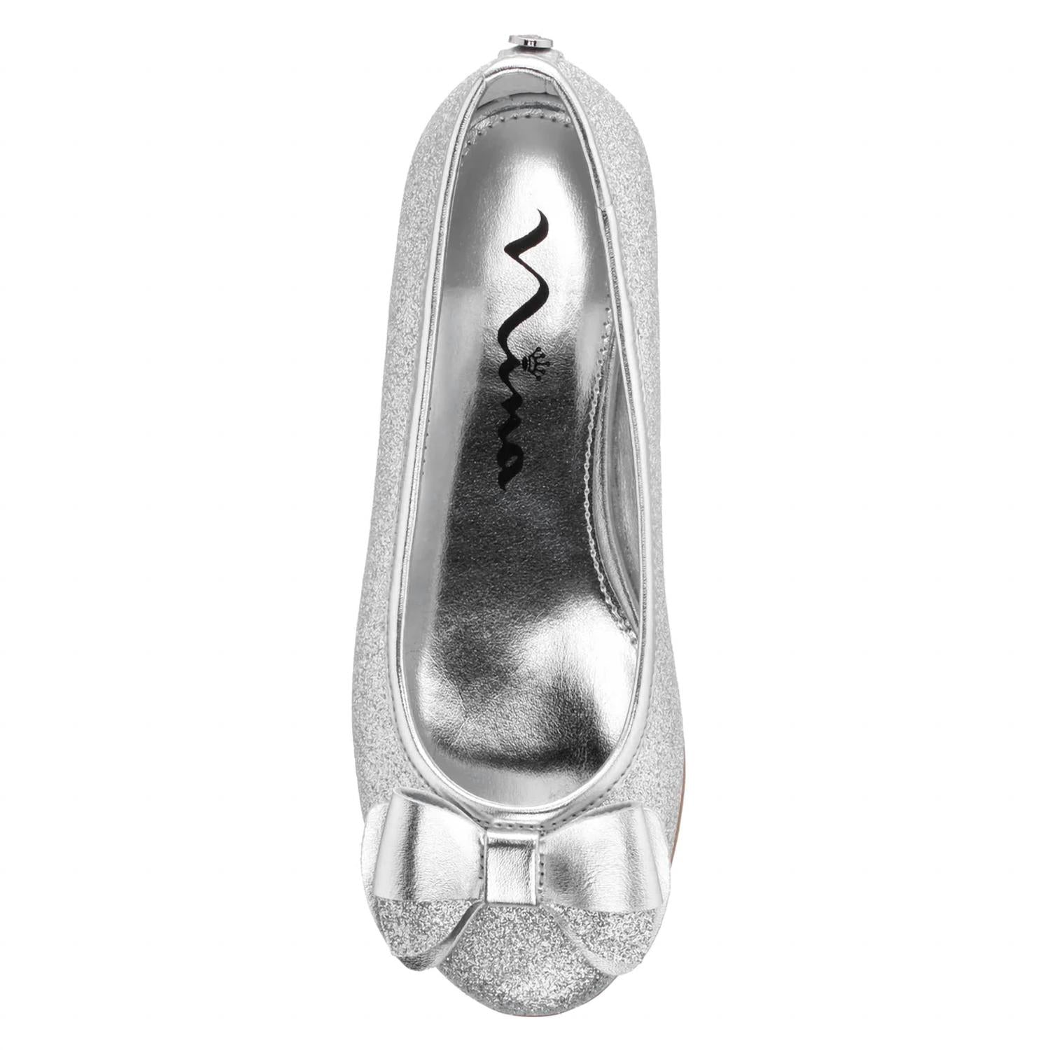 Introducing the Kenzee Ballet Flat by Nina, a sparkling choice for little ones designed to add special charm to every outfit. Crafted from baby glitter and patent vegan leather, these flats feature a decorative bow and cushioned memory foam insole for comfort. The flexible, non-slip TPR outsole ensures stability, while the man-made upper and lining material promising durability. Perfect for toddlers, these shoes bring a touch of silver shine to any occasion.