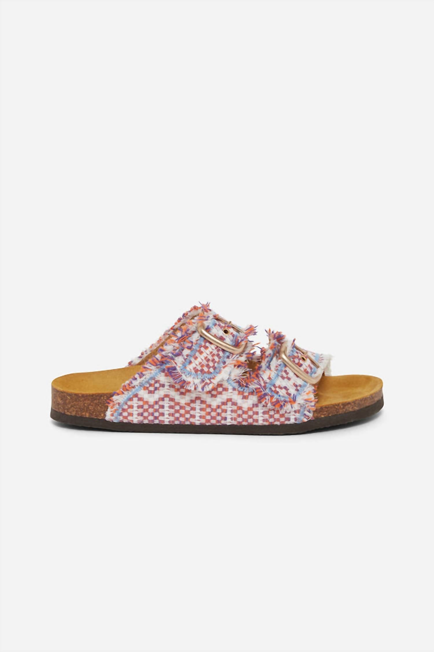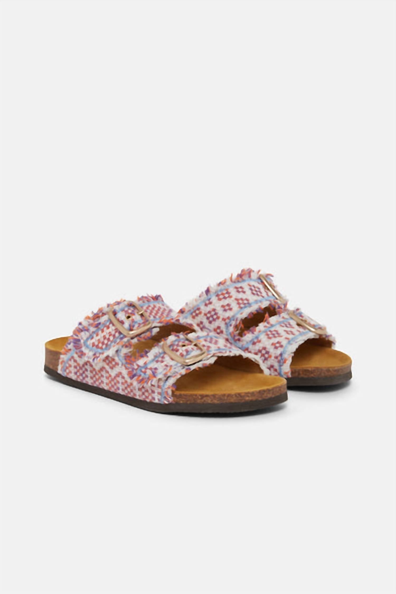 Classicly cute and all-day-wearable. We love this sandal. Introducing the Women's Gemelle Sandals by NinaLeuca, a captivating blend of style and craftsmanship. These flat sandals feature a unique open toe design and are crafted from 100% cotton with leather accents, complete with handmade embroidery details. Entirely made in Italy, they boast a slip-on closure with adjustable buckles for a perfect fit. Ideal for summer vacations, the sandals are presented in a vibrant mix of orange, white, and blue.