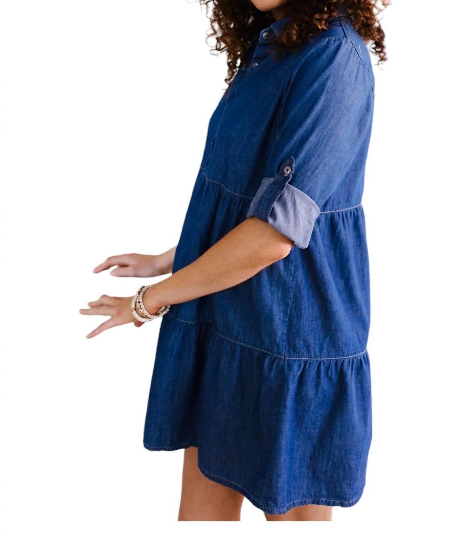 A short and breezy dress for those warmer days.Functional buttons. Roll-tab sleeve. Lightweight. Tiered Skirt. Fits True To Size. 100% Cotton. Wash Cold, Hang Dry.