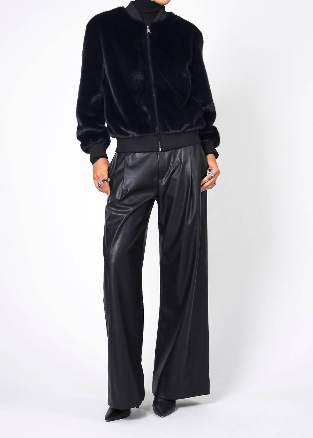 Make any outfit instantly cool by pairing it with this bomber jacket. Introducing the Aurelia Faux Fur Jacket by Nonchalant Label, a chic addition to your outerwear collection. This bomber jacket features long sleeves and a luxurious faux fur composition in a solid navy hue, ideal for minimalist fall style. It is designed with a collar neckline and convenient zip closure, complete with functional pockets. With its elegant design, it's perfect for travel or a New Year's Eve occasion, best maintained with dry cleaning. Model wears size small and stands at 5'11".