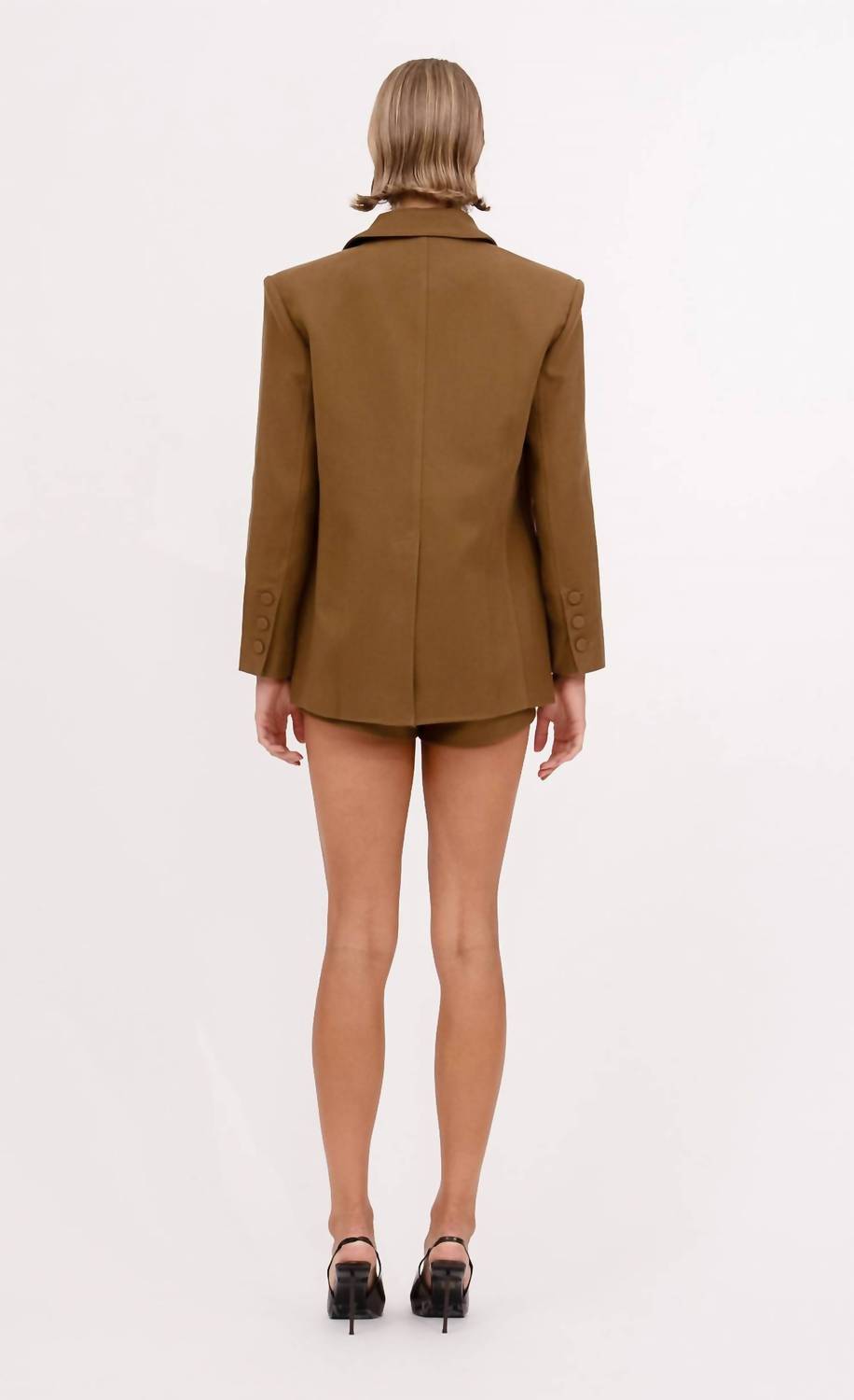 An elevated version of your favorite classic blazer. Elevate your wardrobe with the Nonchalant Label Drew Blazer, a perfect blend of classic design and modern oversized silhouette ideal for workwear. Featuring long sleeves and a solid pattern in a warm brown tone, it makes an ideal choice for fall styling. Crafted from 64% Polyester, 18% Rayon, 18% Wool, this blazer comes with convenient pockets and a button closure.