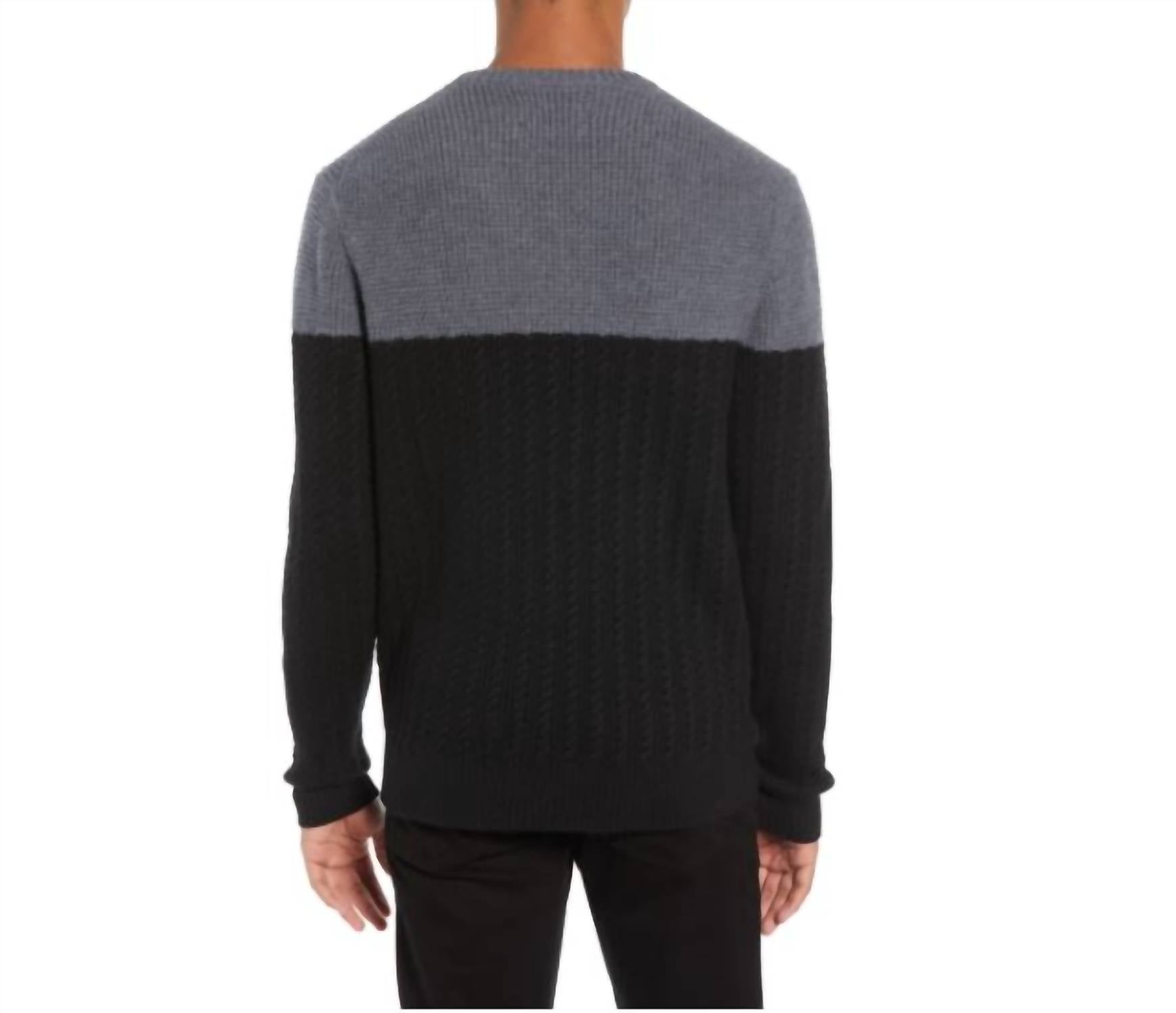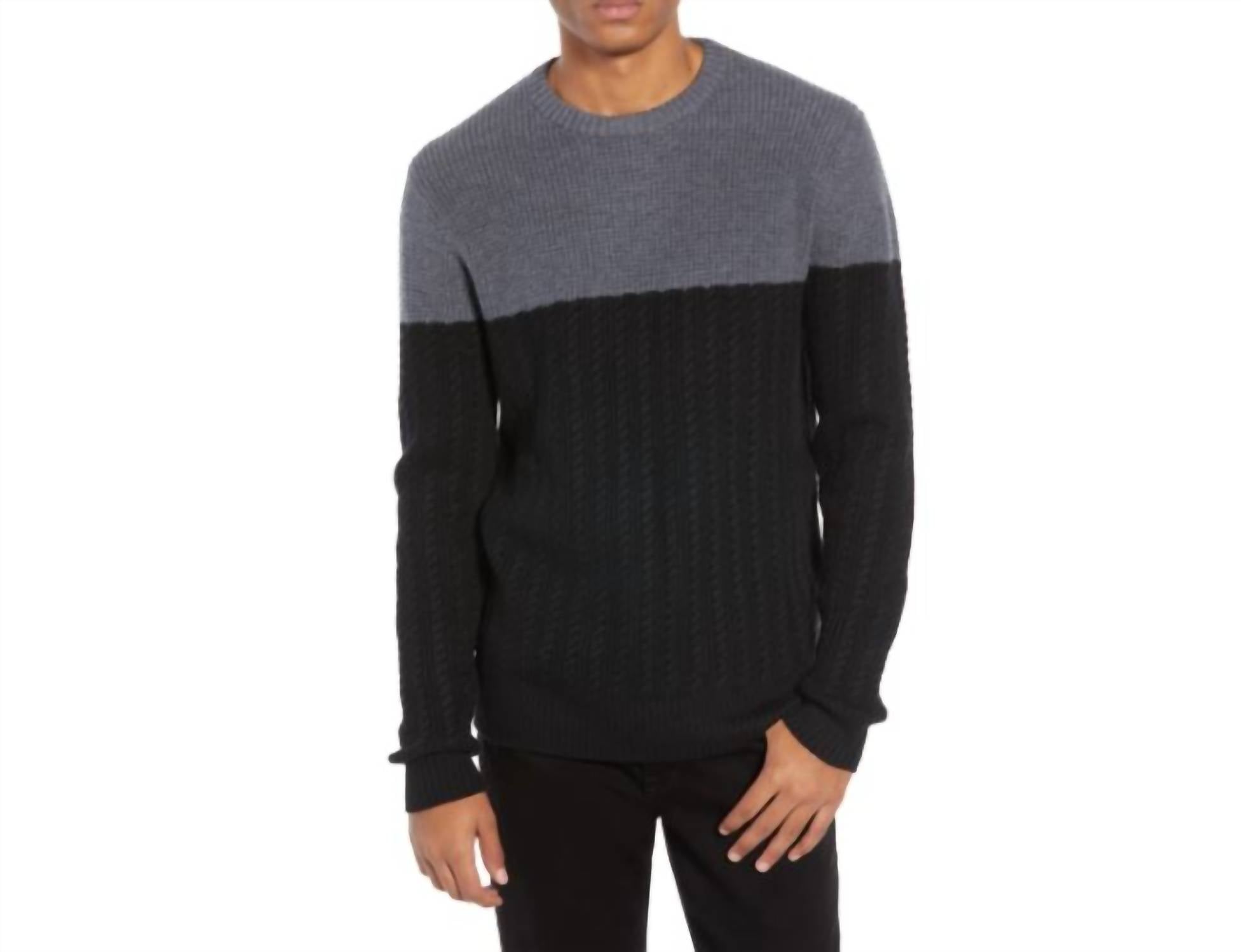 Pure merino wool defines a two-tone sweater with rich cable-knit texture. Considered a Regular fit; cut with a little extra room through the chest and body for comfort. Crewneck Ribbed collar, cuffs and hem 100% wool Dry clean Length 29"