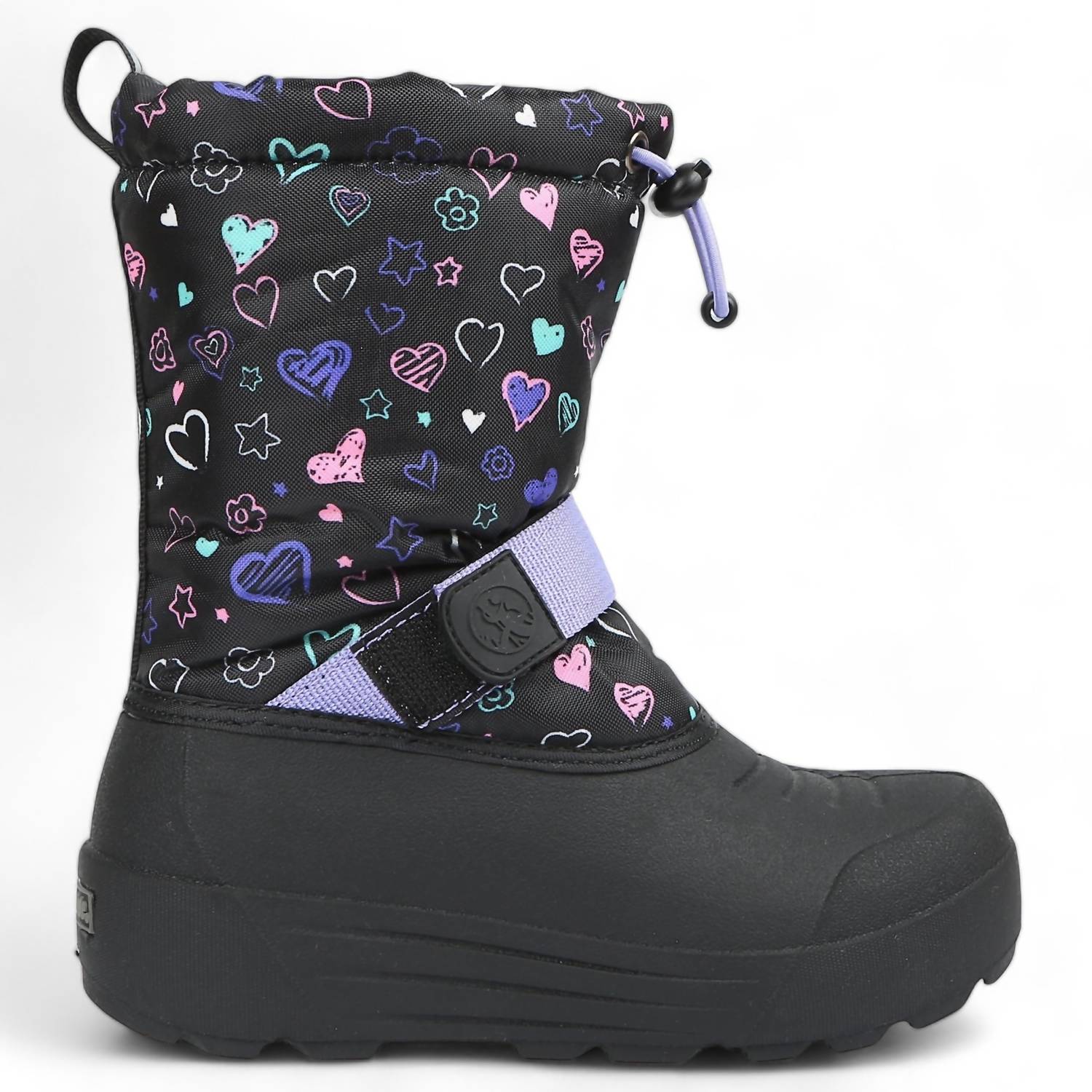 These boots feature a water-resistant nylon upper and a lightweight, waterproof TPR shell with a fully insulated lining. The 200g Thinsulate lining is rated for -25 degrees Fahrenheit, providing exceptional warmth. The removable and washable cushioned EVA insole, along with the padded lining, offers extra cushioning for little feet. The durable multi-directional outsole ensures excellent traction. The boots are designed with a round toe, hook-and-loop closure, and a padded footbed for added comfort. The construction includes a nylon upper, man-made lining, and TPR outsole.