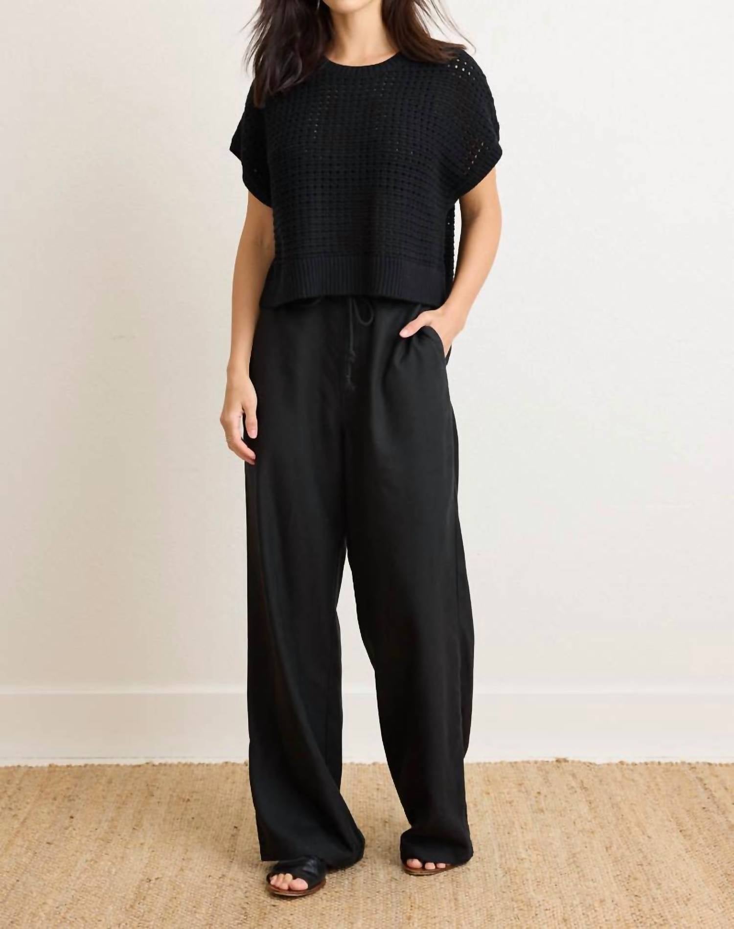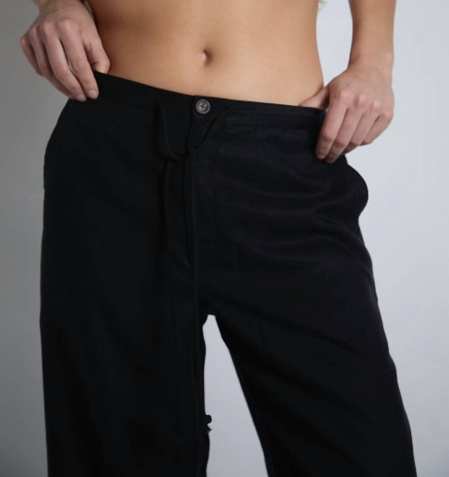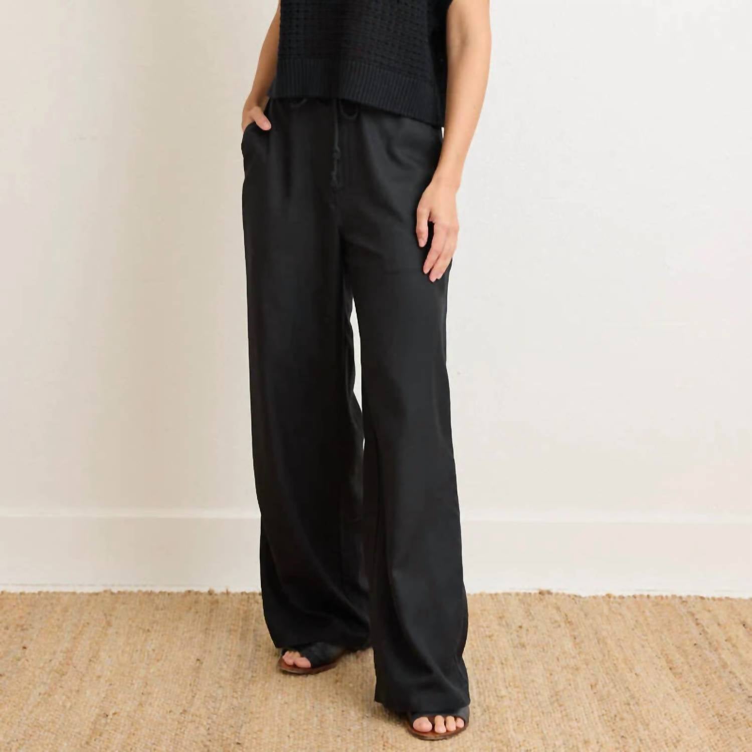 Discover the Brynn Tie Front Pant by NOT MONDAY, a chic addition to your summer wardrobe in classic black. Designed with a relaxed wide-leg fit and a solid pattern, it's perfect for vacation and Thanksgiving occasions. Crafted from 90% Tencel and 10% Linen, these pants feature a convenient button closure and pockets for added functionality. Recommended care includes dry cleaning or hand washing cold, laying flat to dry, and ironing on low.