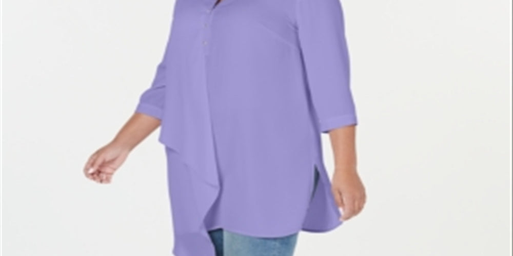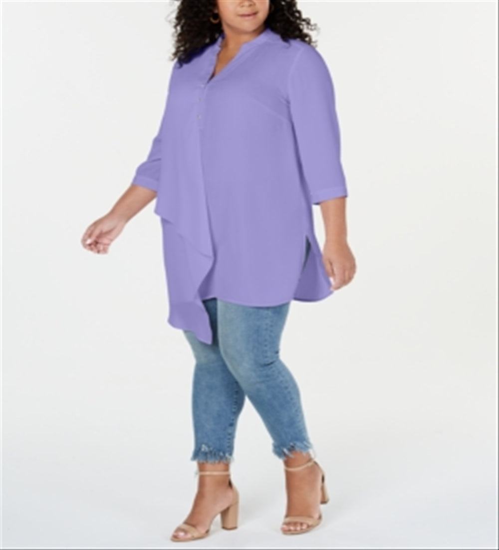 A unique piece to add to your wardrobe| this NY Collection plus size top has a foldover chiffon hem and cuffed sleeves to stand out from your regular basic tops.| Hits at thigh| Y-neck; front button closures| Side slits; asymmetrical chiffon overlay at front| 3/4-sleeves with buttoned cuffs| Polyester
