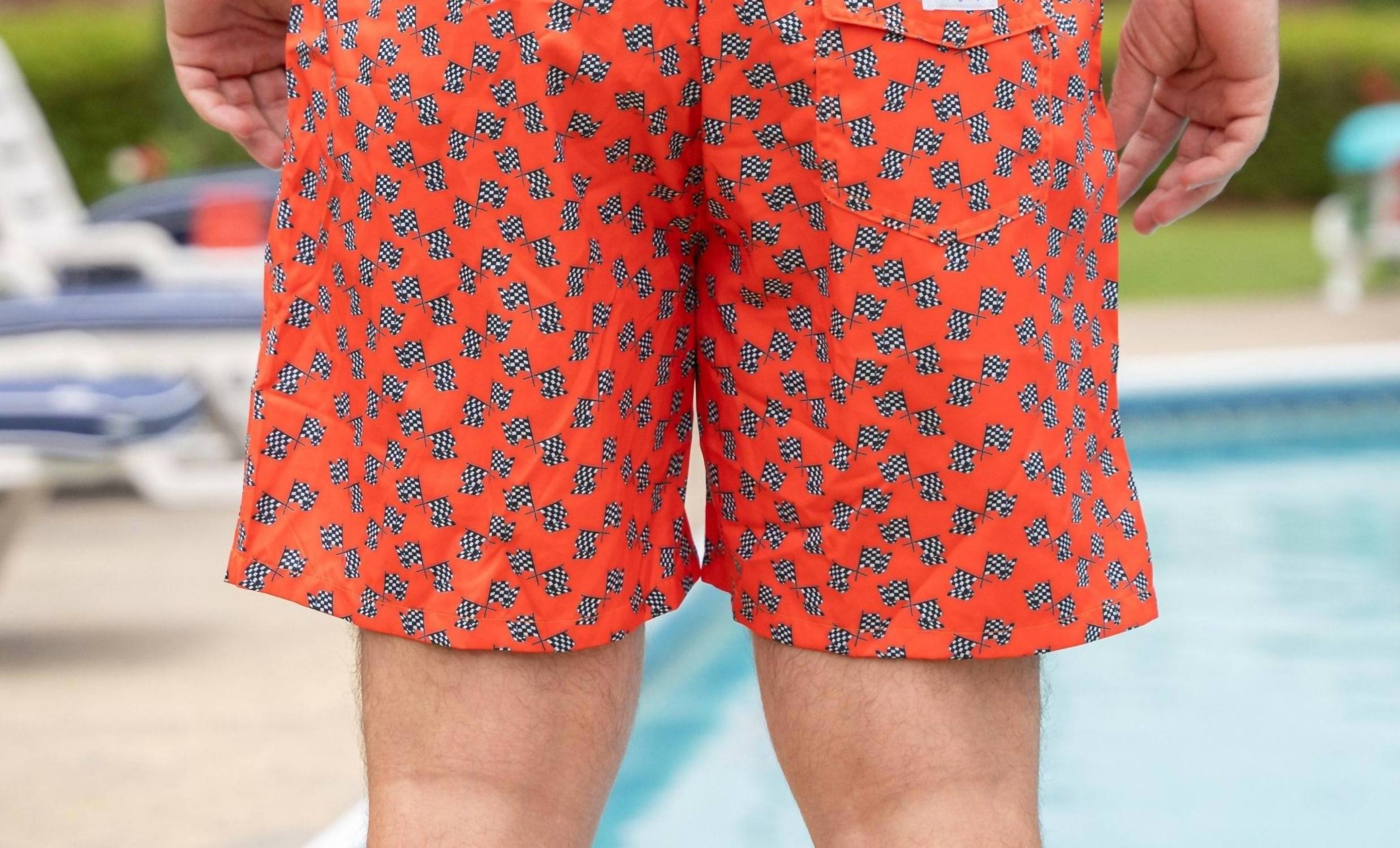 Introducing the Checkered Flag Lined Swim Trunks by Old South Apparel, a stylish addition to your summer wardrobe in vibrant orange. These trunks are designed with a 6.5" inseam that sits right above the knee, offering classic coverage. Crafted from a quick-dry blend of 95% Polyester and 5% Spandex, they feature 4-way stretch for optimal movement. The elastic waistband with soft netting ensures a comfortable fit, while the practical side, back, and inside pockets provide ample storage. Care: Machine wash and tumble dry.