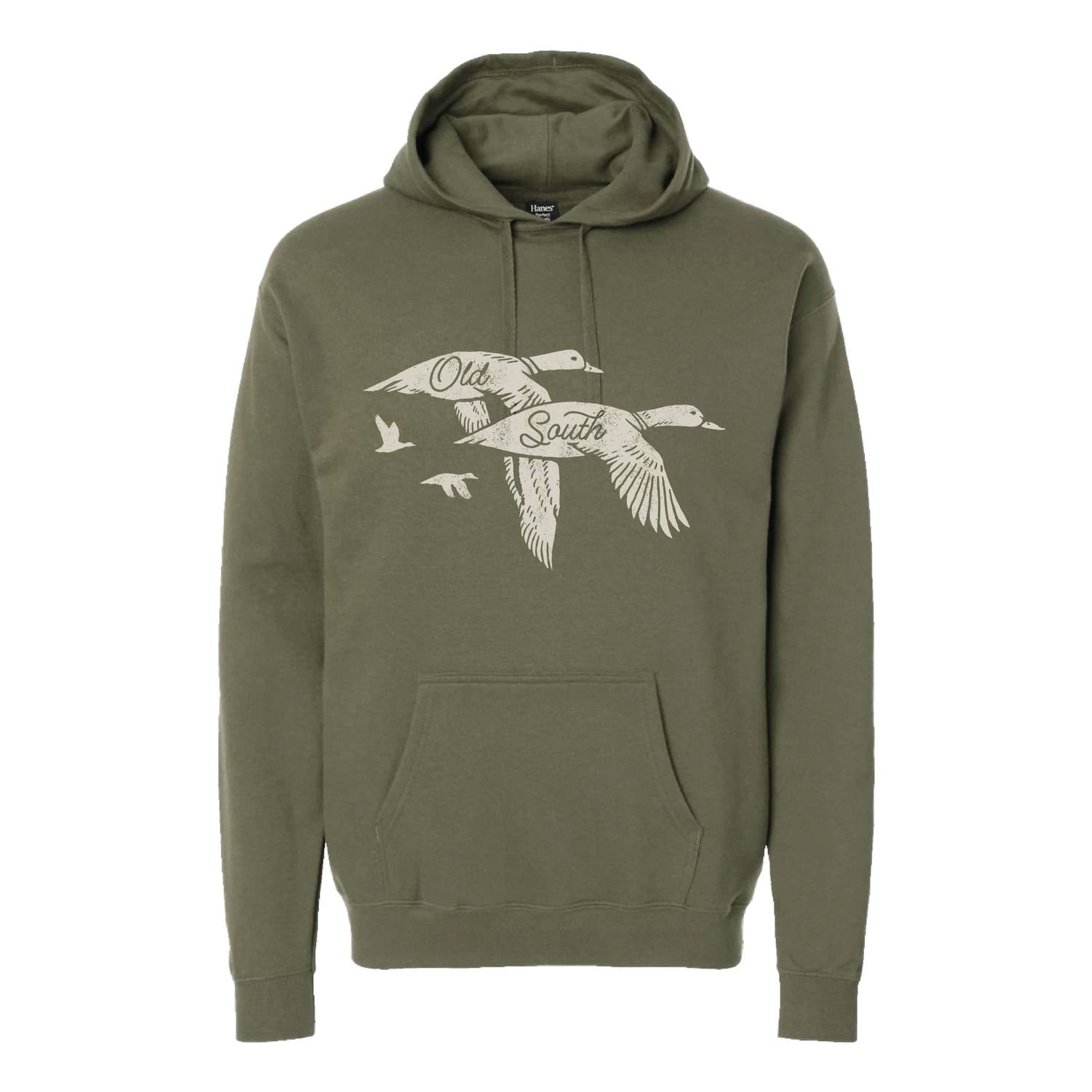 Introducing the Duck Pair Hoodie by Old South Apparel, a stylish choice for travel and streetwear enthusiasts. This fatigue green hoodie is composed of 80% cotton and 20% polyester, providing comfort with long sleeves and a hooded neckline. The apparel features a hand-drawn front chest logo and durable construction with a ribbed collar and double-needle stitching. Closure type: Pull-on. Care: Machine wash and tumble dry as needed. Perfect for making a statement during the spring season.