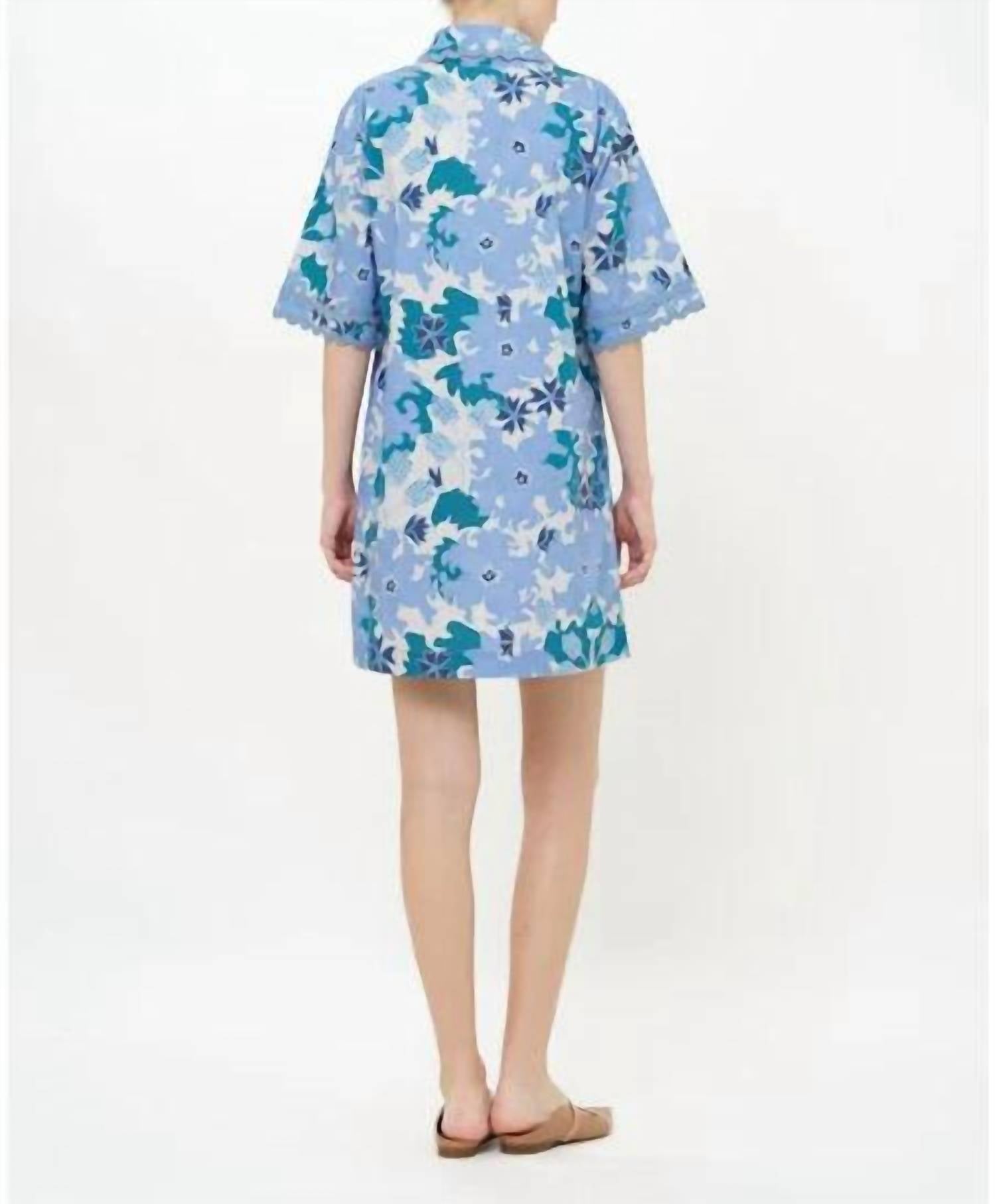 The perfect mini dress for those warmer months. Unveil a playful twist on classic shirting with the Suzani Blue Collared Shirt Mini Dress by Oliphant, perfect for making a statement. This mini dress features a crisp collar and short sleeves, crafted from breathable cotton, and designed for effortless chic. The bold, patterned fabric exudes boho chic vibes, ideal for Thanksgiving gatherings or holiday parties. Closure is achieved with a convenient button closure.