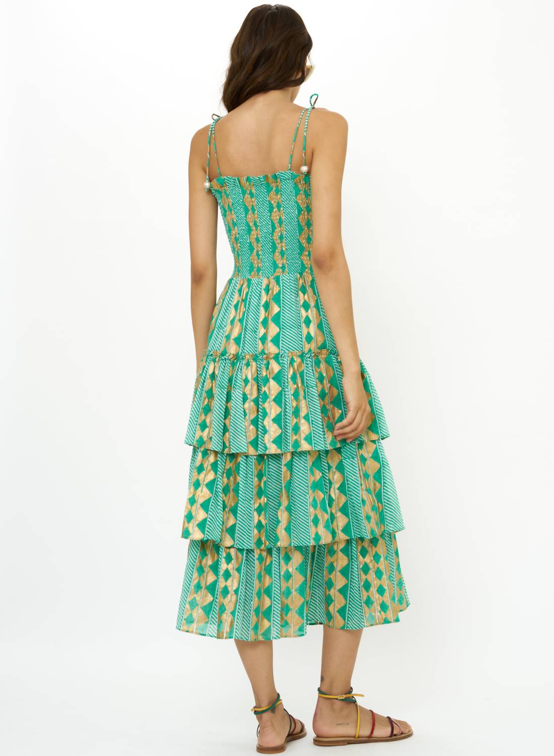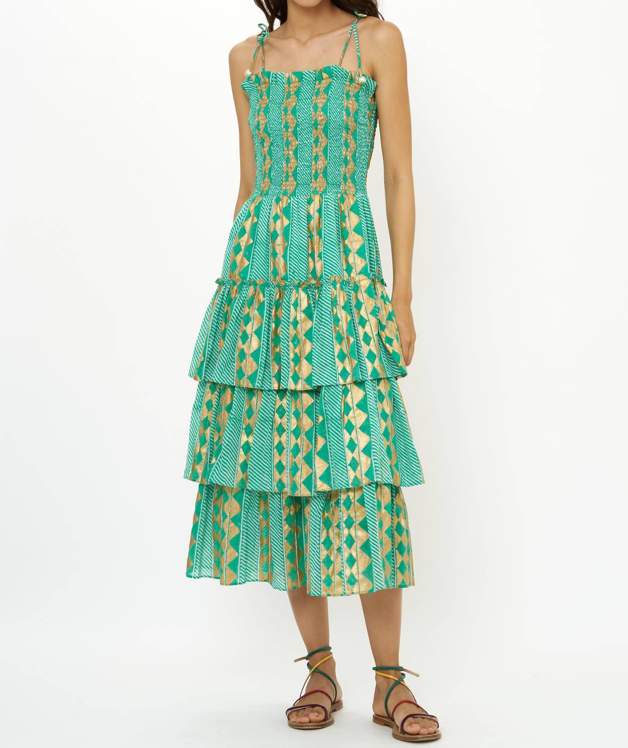 Just add slides or mules and you are good to go. Experience the charm of the Smocked Tie Strap Ruffle Midi Dress by Oliphant in a vibrant Ascot Teal hue. This sleeveless A-line dress features a playful design with adjustable tie straps and a smocked bodice for a snug yet comfortable fit. Made from breathable cotton, it presents a patterned aesthetic and a carefree midi length, ideal for vacation adventures. Closure: Pull on. Care: Machine wash, tumble dry.