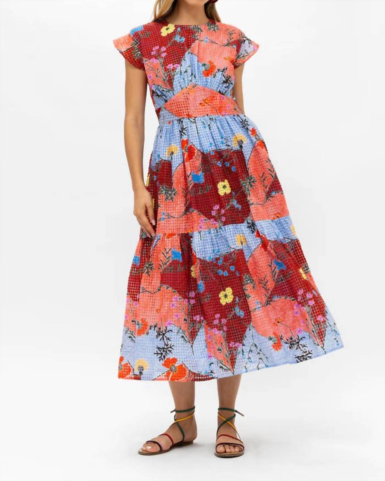 A midi dress so versatile, your options for wearing it are endless. Presenting the Stockholm Midi Dress by Oliphant, a stunning piece in a vibrant sienna floral pattern. Featuring cap sleeves and a crewneck, this dress boasts a sophisticated tailored empire waist and an elegant tiered A-line silhouette. It is crafted from specialty open weave cotton and includes a hidden zip closure down the back. Care for this beautiful dress by washing it on a cold delicate cycle; lay flat to dry or hang and always turn inside out before washing if adorned with appliqués or gold-painted detailing.