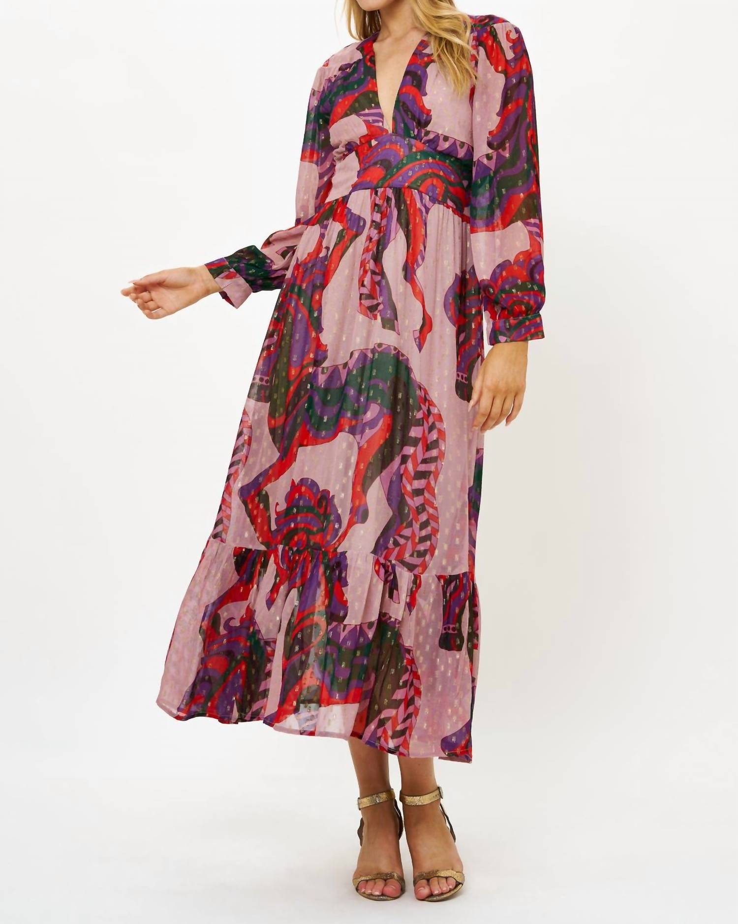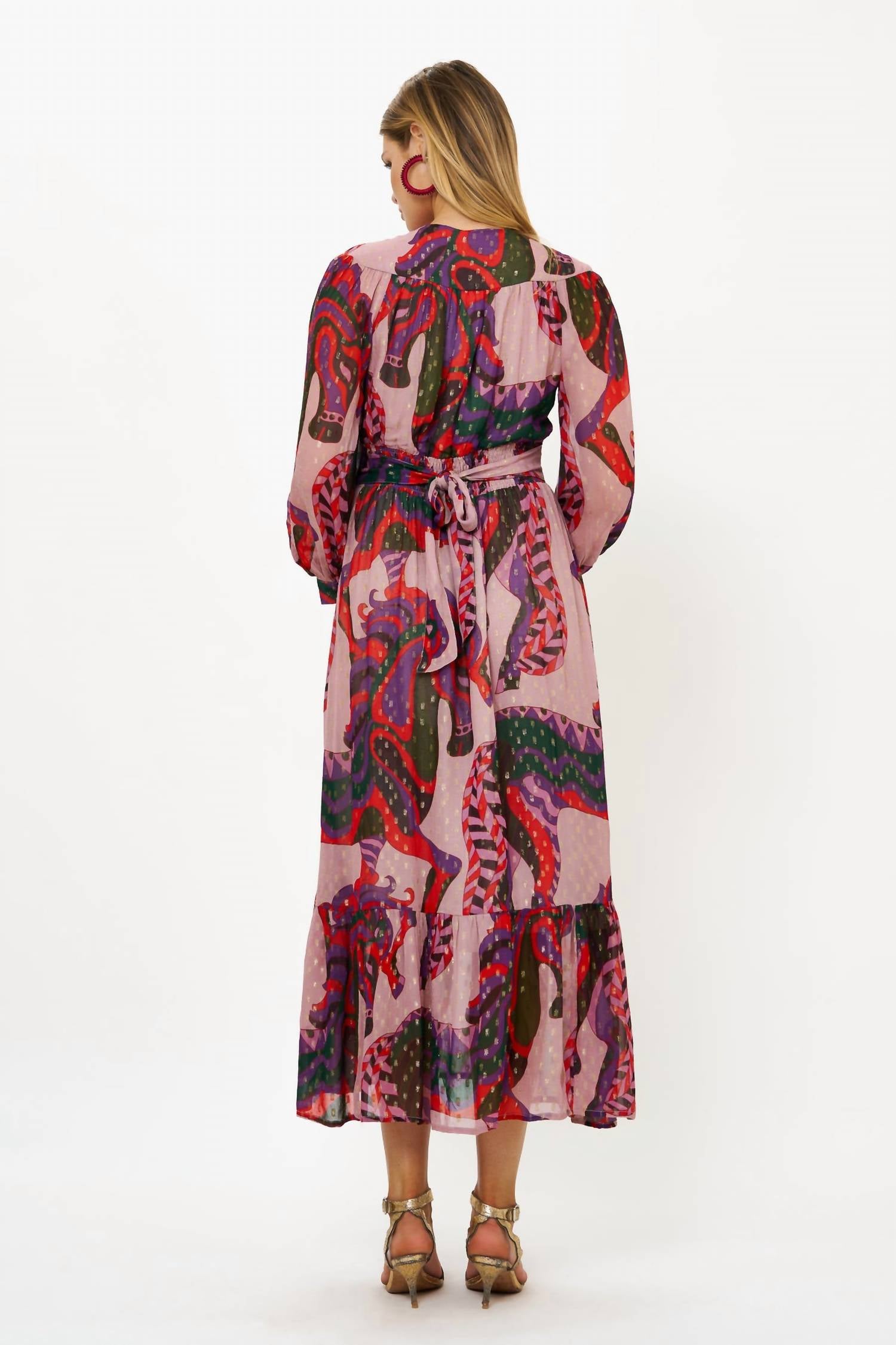 Introducing the Tie Back Maxi Dress by Oliphant, a statement piece in an eye-catching Arabia/Crimson graphic pattern. Crafted from georgette viscose and embellished with gold lurex thread, it boasts long sleeves with tailored cuffs and a flirty maxi hemline. The V-neckline features a hook and eye closure, while a fitted bodice with smocking detail cinches the waist, highlighted by an attached tie back belt. Care for this pullover style with a gentle hand wash in cold water, laying flat or hanging dry, and turning it inside out before washing.