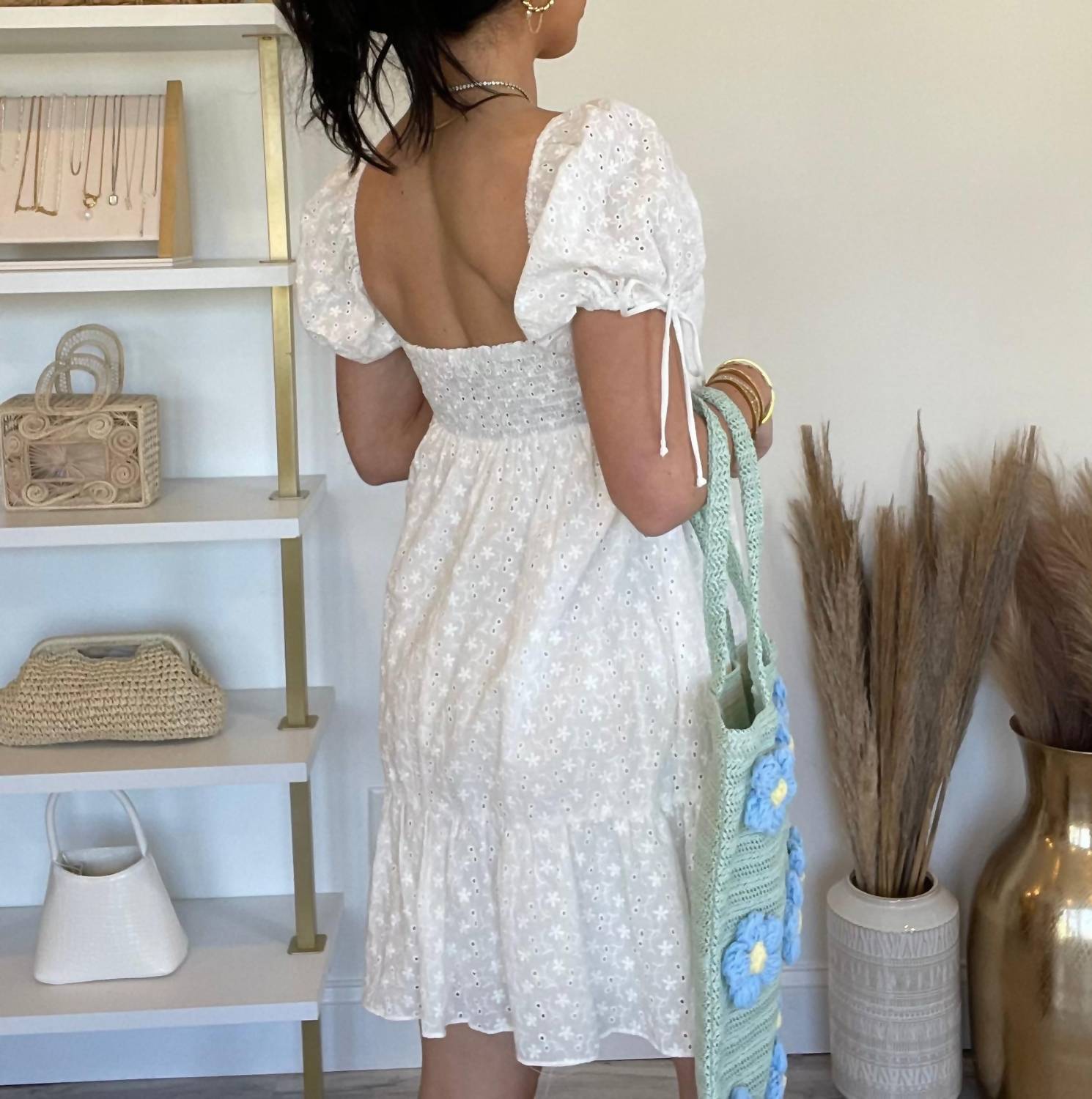 A short and breezy dress for those warmer days. Experience effortless elegance with the Bardot Eyelet Babydoll Dress by OLIVACEOUS, a perfect choice for your spring occasions. This white, short-sleeve dress features intricate eyelet details, a graceful sweetheart neckline, and a flattering A-line silhouette. Made from 100% cotton, it offers a comfortable woven texture with a smocked back for a tailored fit. Care instructions include hand washing and laying flat to dry.