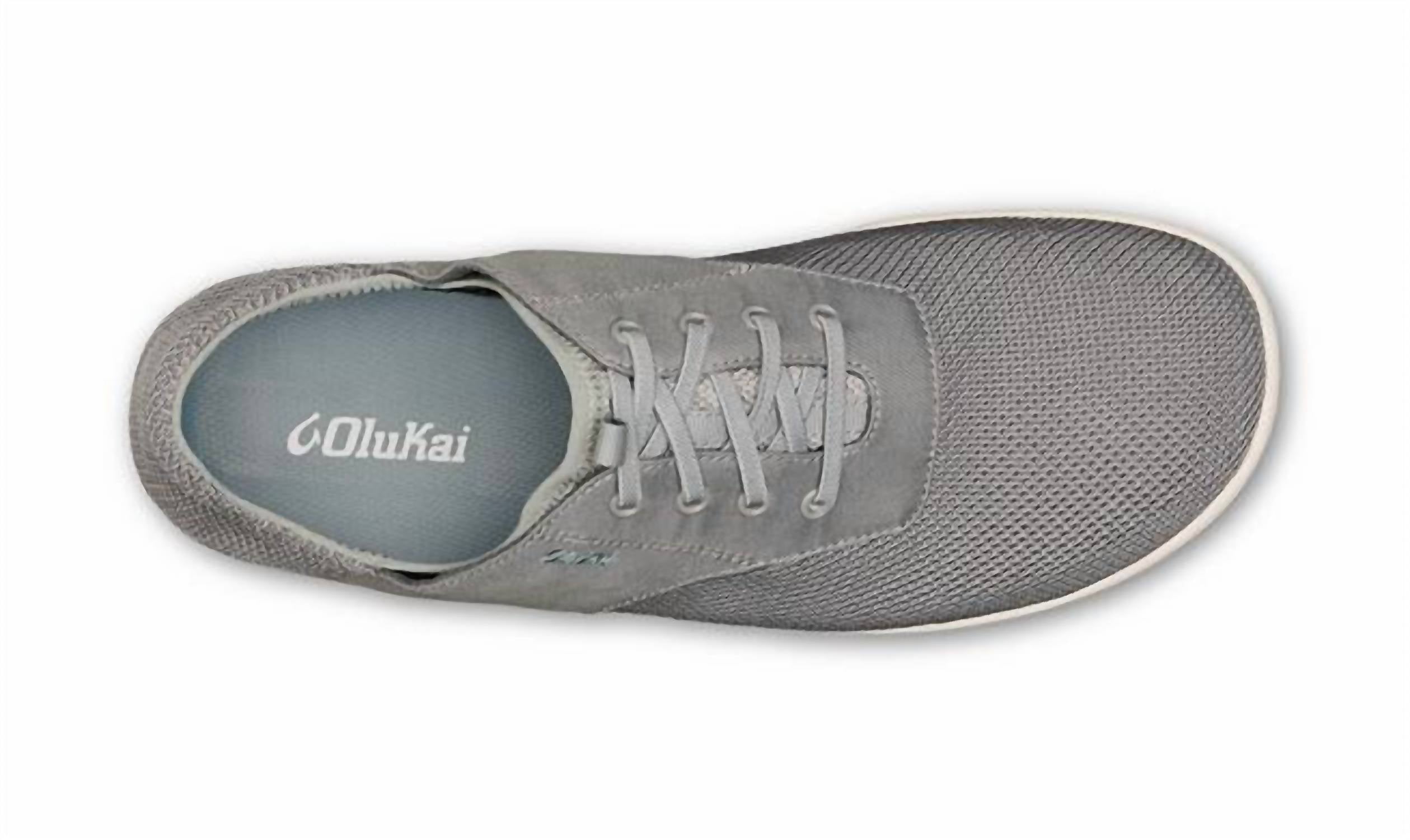 Embrace the minimalist trend with OluKai's Men's Nohea Moku Sharkskin Sneakers, designed in a versatile gray shade. These sneakers are perfect for summer, featuring a flat heel and a round toe for all-day comfort during travel. The no-tie laces and stretch bootie construction allow for easy barefoot wear, making them ideal for both terrestrial and amphibious adventures. Step confidently into the season with these stylish and practical sneakers.