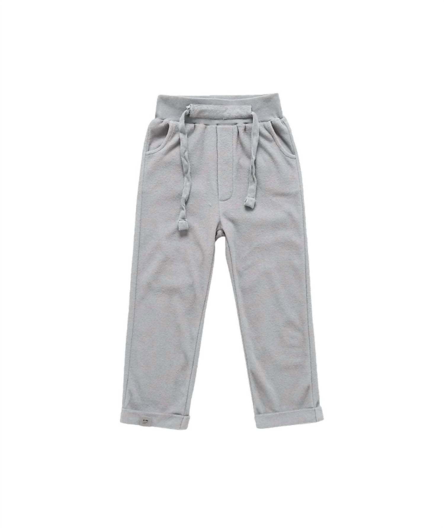 Patch on waistband between the drawstrings, embossed faux suede logo label on cuff, and just the right relaxed fit. Tapered down pants with rolled and tucked cuff. Rounded top stitch front pockets. Welt back pocket. 100% cotton terry cloth.