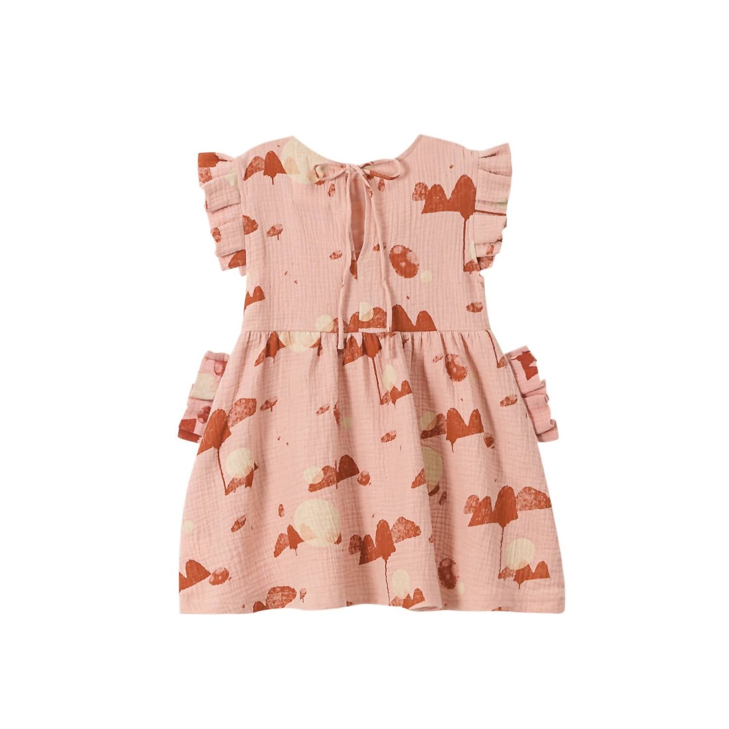 Edgy box pleated sleeve and pocket ruffle and our favorite print inspired by high desert sunsets. Fit and flare silhouette with generously shirred skirt is perfect for a special event or family pictures but also comfortable enough for everyday adventures. In-seam side pockets. Back tie closure. Elasticized waist. 100% cotton. Machine wash and dry.