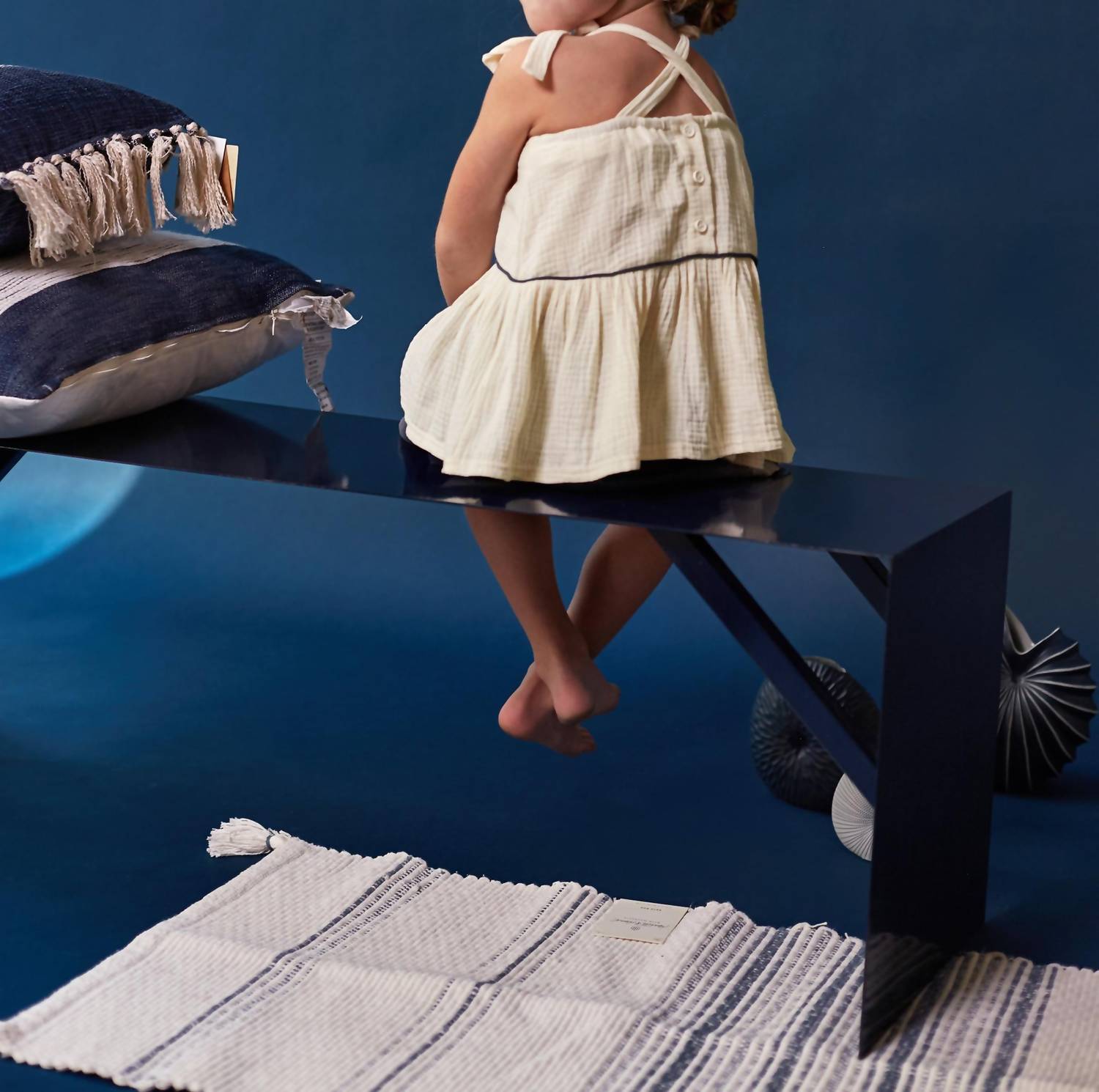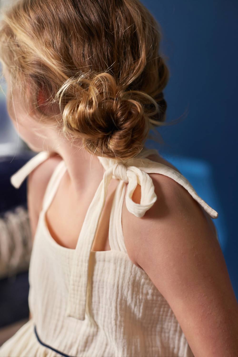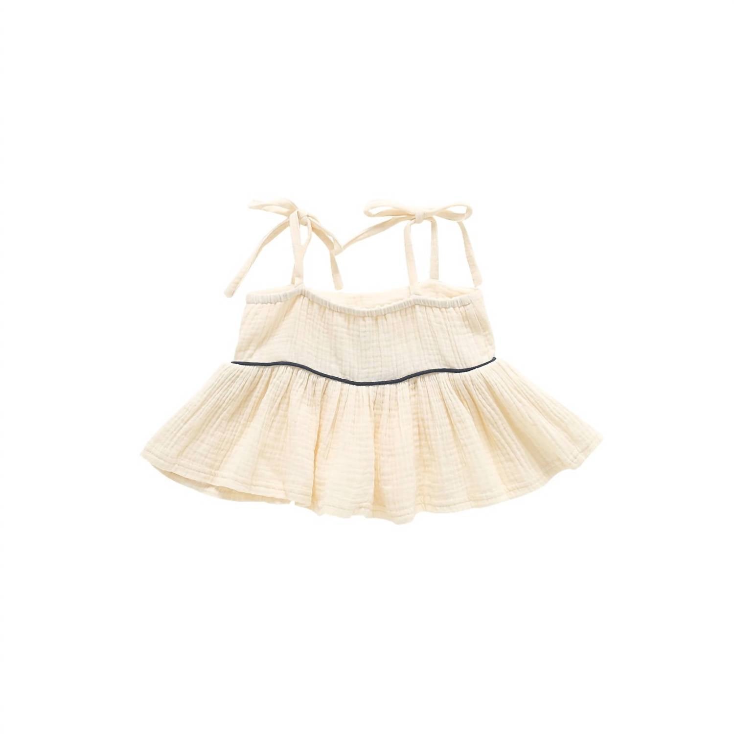 Cross tie at the back, contrast piping is perfect with leggings or denim skirt. Elastic back. Buttons opening. Faux suede logo label. 100% cotton gauze fabric.