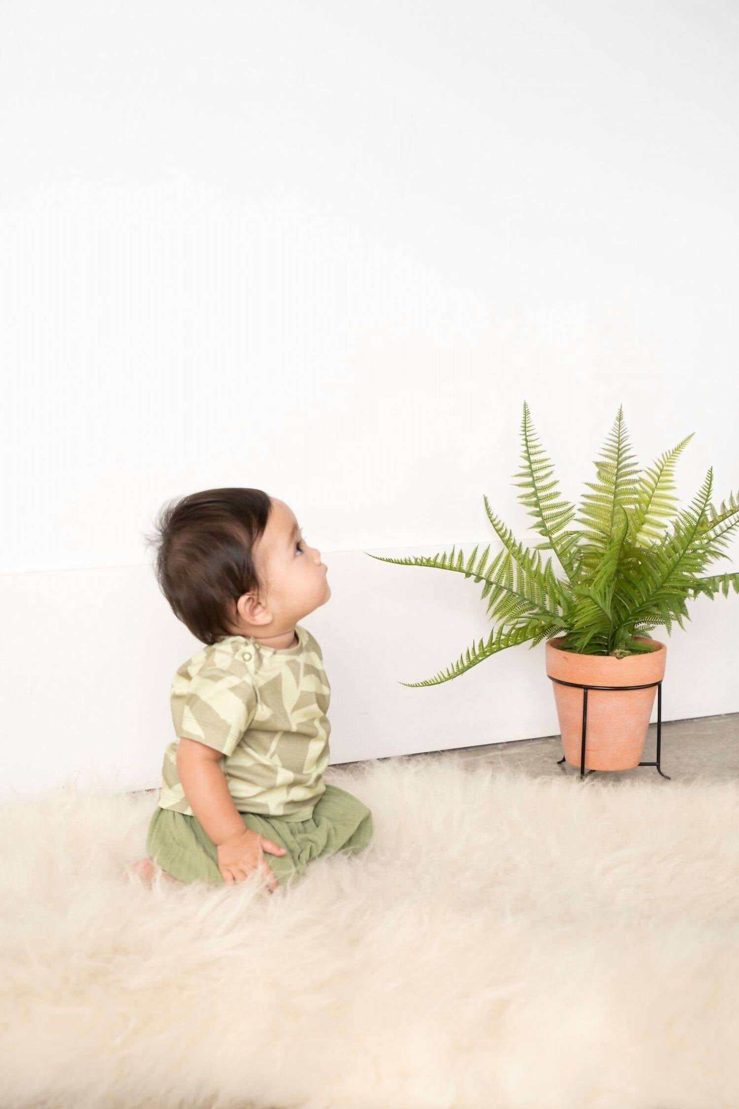 Boxy fit, super soft, durable cotton jersey and our signature palm leaves print. Snaps on shoulder for easy dressing. Crew neck with inner binding. 100% cotton jersey.