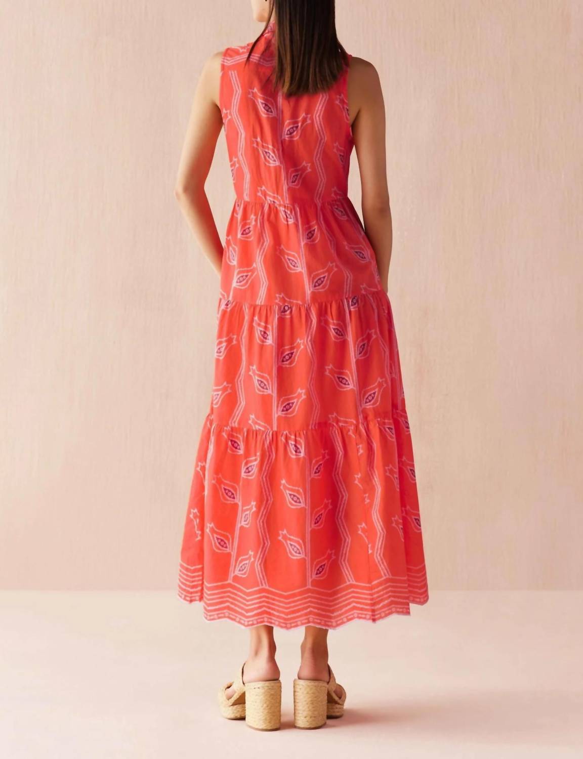 A flattering yet comfortable dress you'll be reaching for season after season. Introducing the Women's Emeline Maxi Dress by OMIKA in the vibrant Vani Papaya hue, perfect for summer occasions. This sleeveless dress features a chic collar and button closure, with a tiered skirt and a detachable sash belt for versatile styling. Made from 100% Cotton, the maxi-length dress measures 53 ½ inches from size S, ensuring a flattering A-line silhouette. Care instructions recommend machine washing and line drying to maintain its quality.