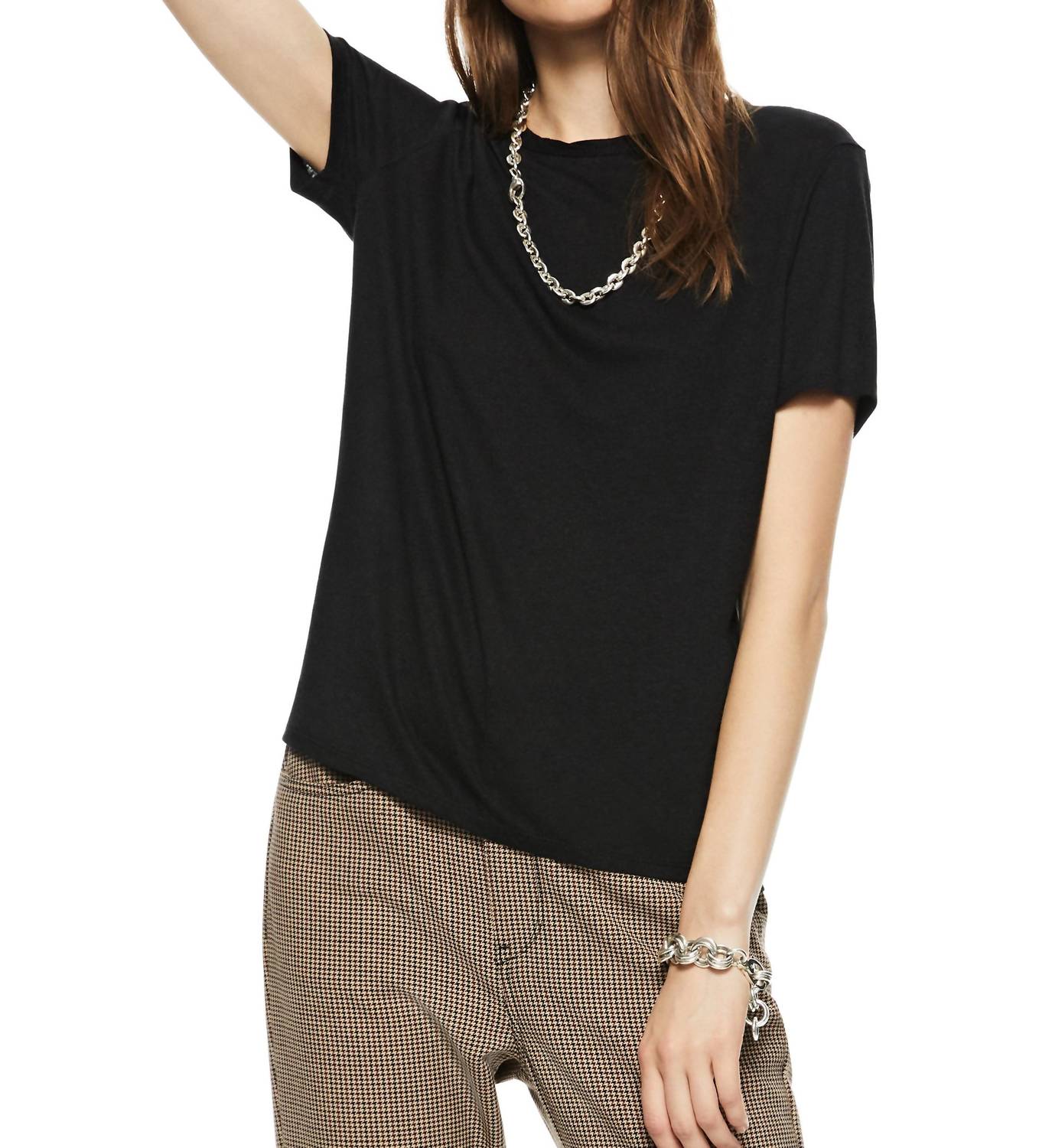 Look no further, you just found your perfect tee! A versatile wardrobe option for women in classic black with a bias cut crew neckline. Crafted from a soft linen blend, this short sleeve tee features a pull-on closure for ease of styling.