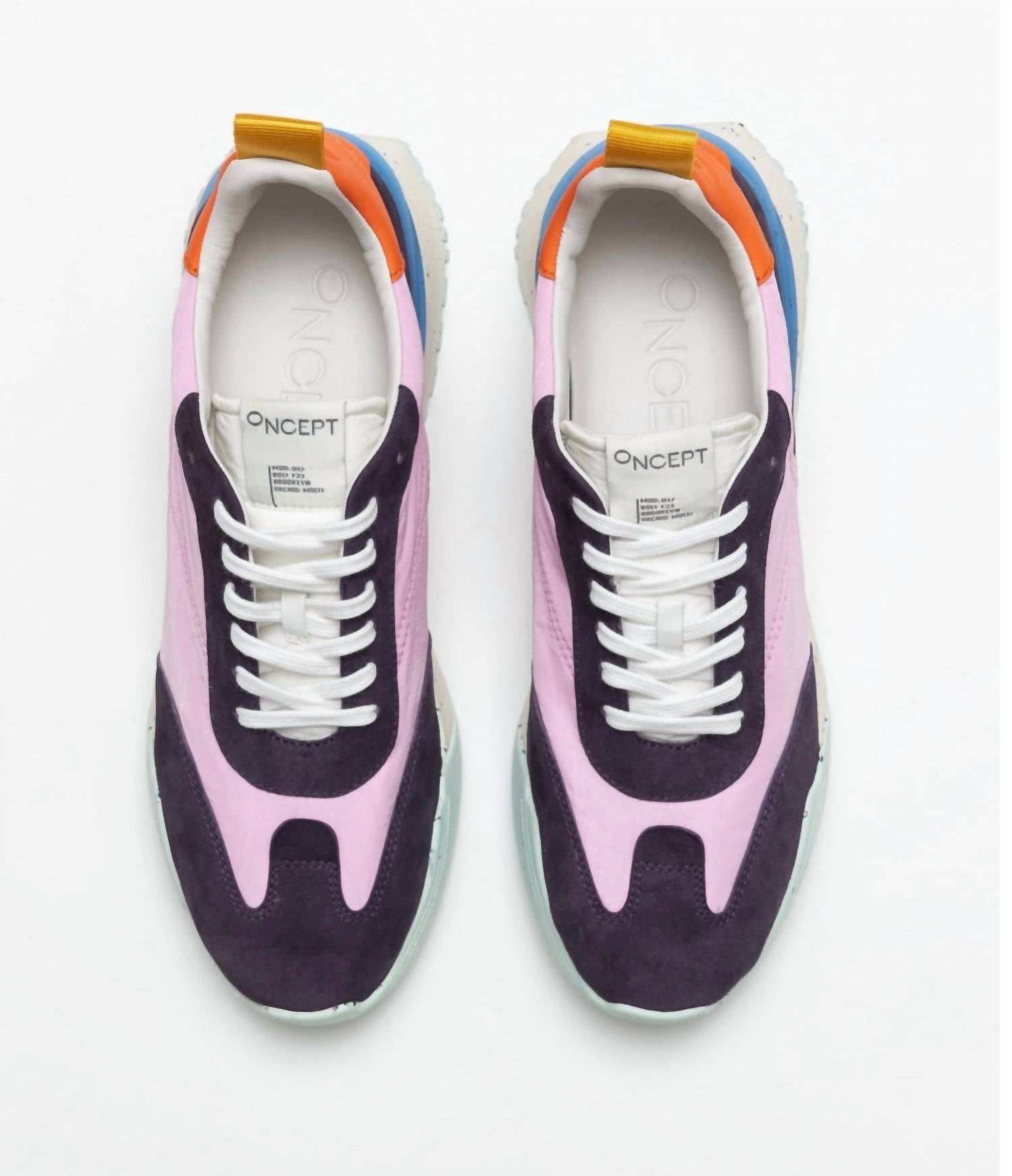 When fashion and function come together seamlessly. Introducing the Women's Brooklyn Sneaker by Oncept, a visionary piece in Orchid Multi that combines eco-conscious design with bold, futuristic aesthetics. Featuring a water-resistant re-nylon upper, chrome-free suede, and Tencel twill linings, this sneaker is crafted for sustainability. The round toe design and molded removable sock footbed ensure comfort, while the re-speckled sole with a refined groove offers flexibility. Designed to run true to size, this stylish sneaker effortlessly enhances your stride.