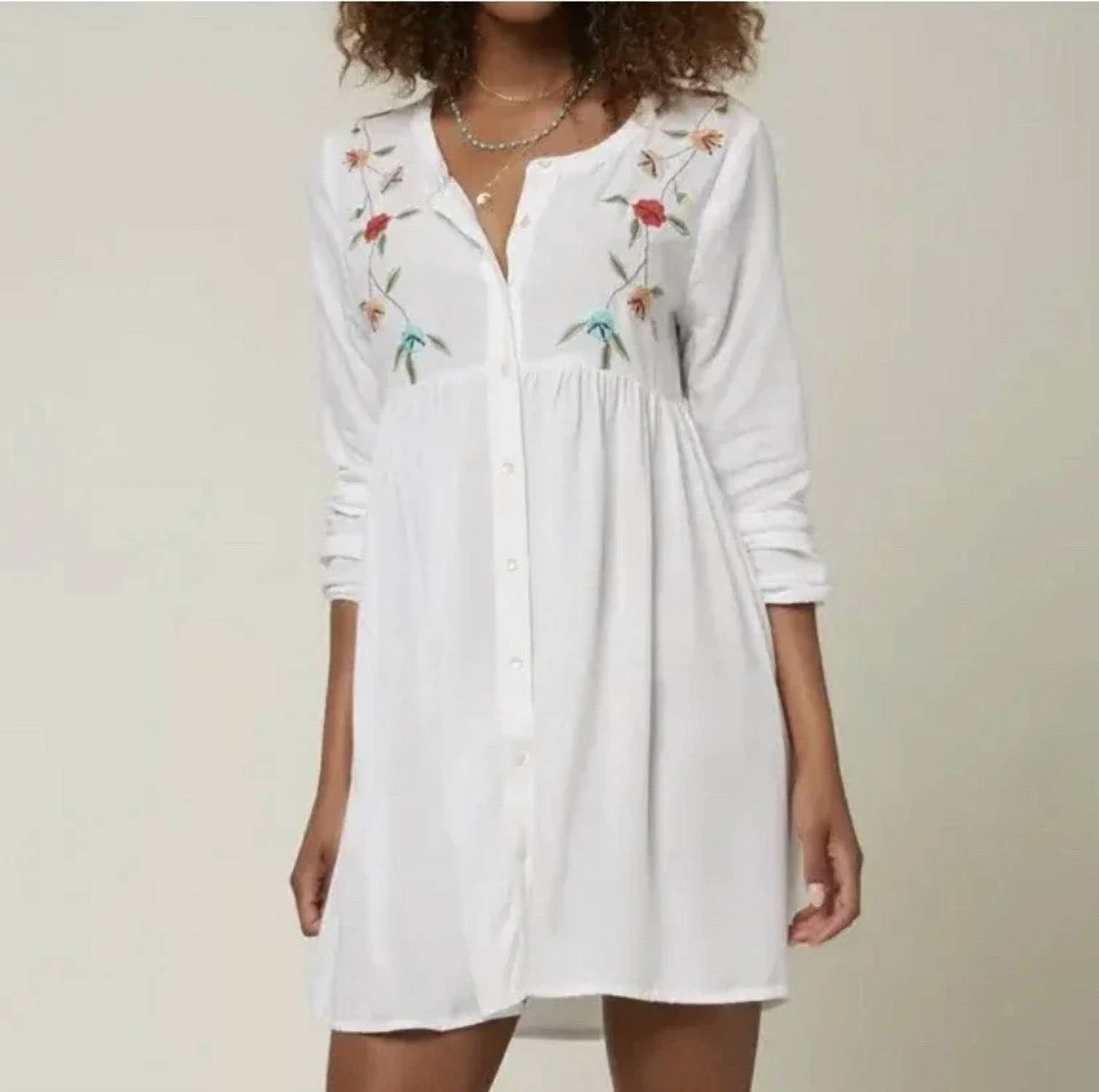 A short and breezy dress for those warmer days. Introducing the Edan Embroidered Button Up Mini Dress by O'NEILL, a must-have for your spring wardrobe in a sophisticated white hue. This boho chic dress features a flattering A-line silhouette with long sleeves and a stylish V-neck, perfect for occasions like Thanksgiving or a Baby Shower. Closure comes with a button-up design, adding to its elegant simplicity. Care instructions: Hand wash and lay flat to dry.