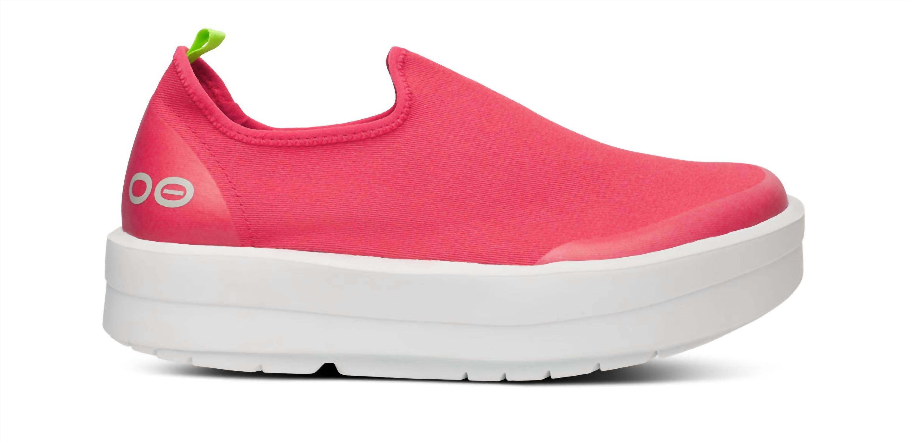 The Women's Oomega Eezee Low Shoe by OOFOS revolutionizes active recovery with a modern twist in a vibrant Neon Berry color. Designed as a women's platform shoe featuring the trendy platform heel, it offers a round toe shape perfectly suited for summer travel and athleisure wear. The standout feature is its MEGA midsole, providing an additional 15mm of impact-absorbing OOfoam™ technology, ensuring comfort and style like never before. Embrace this trend-setting combination of innovation and fashion for an unparalleled recovery experience day or night.