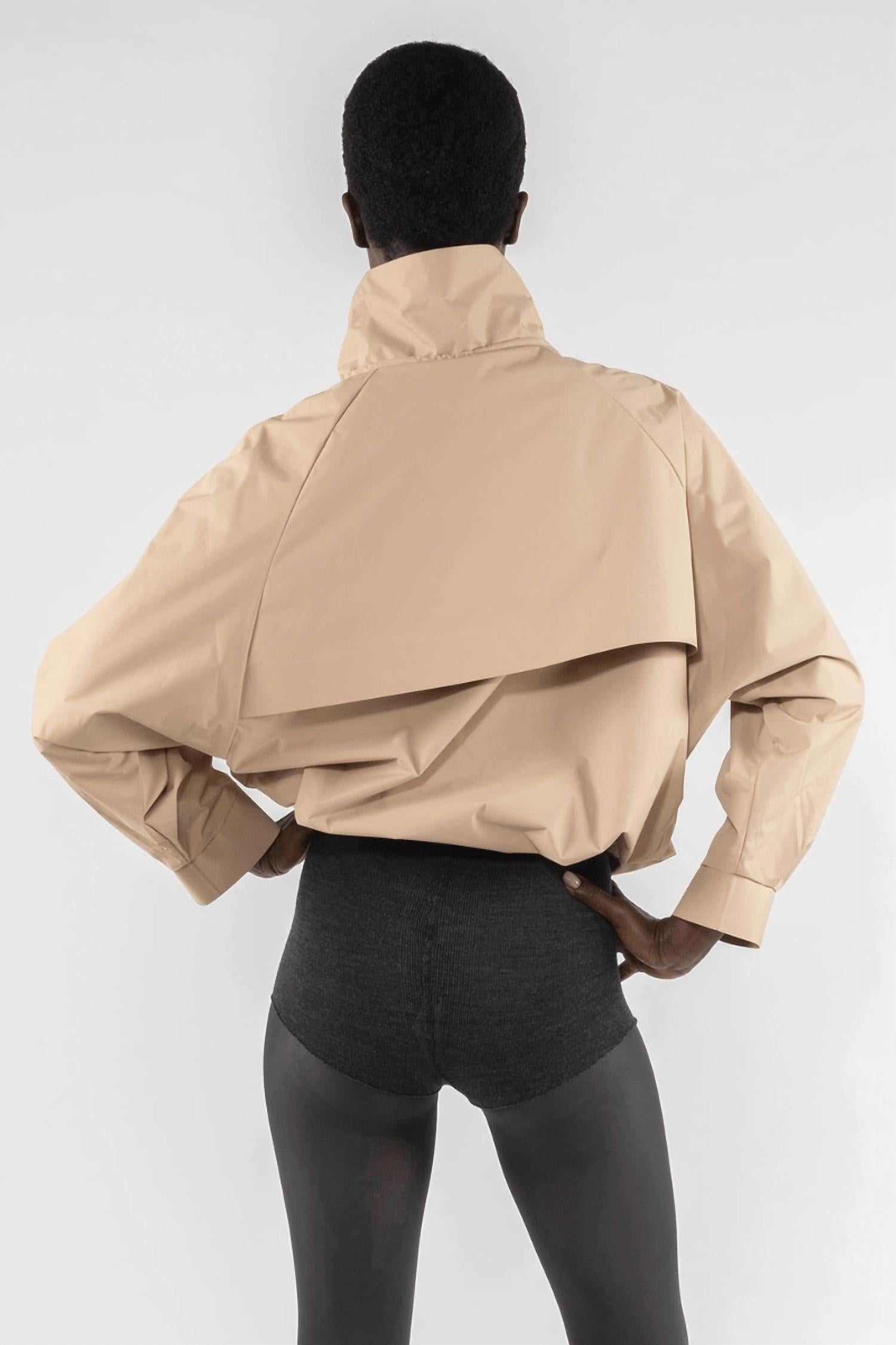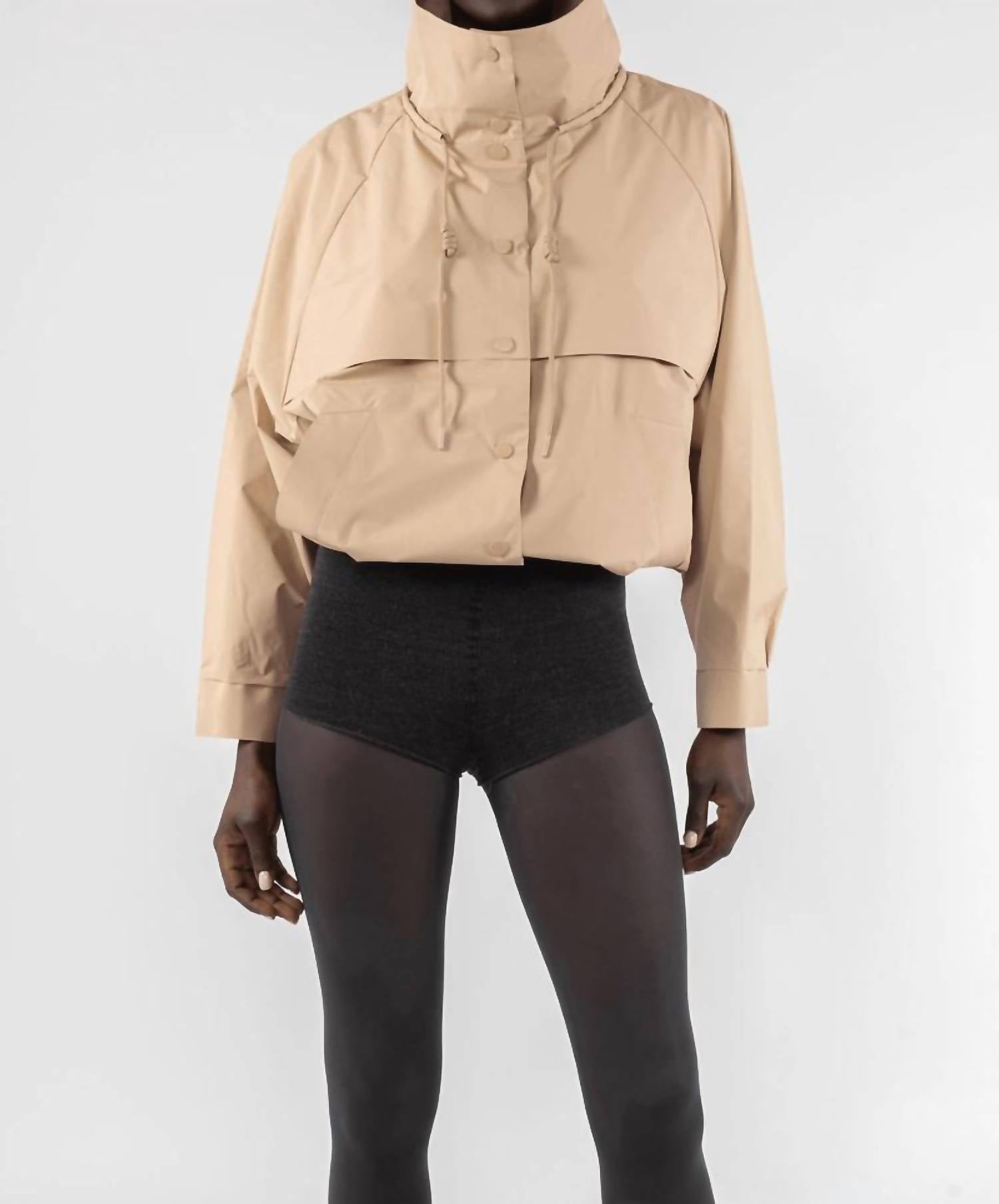 A casual yet cool jacket that every closset needs. Elevate your spring wardrobe with the OOFWEAR Water Repellent Short Jacket in sand, perfect for travel and athleisure activities. This women's casual jacket features long raglan sleeves and a stand collar with adjustable drawstring, crafted from 100% polyester with a water-repellent silver laminated finish. Details include snap button front closure, welt pockets, gathered cuffs, and a drawstring bottom hem for a customizable fit. Care instructions: Machine wash.