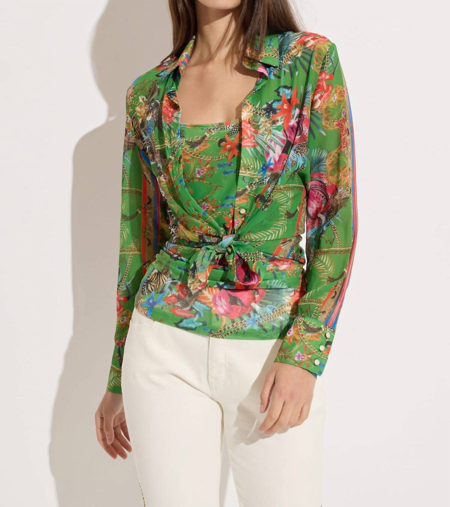 Oolala - Jungle Print Chiffon Button Down Blouse With Mesh Top