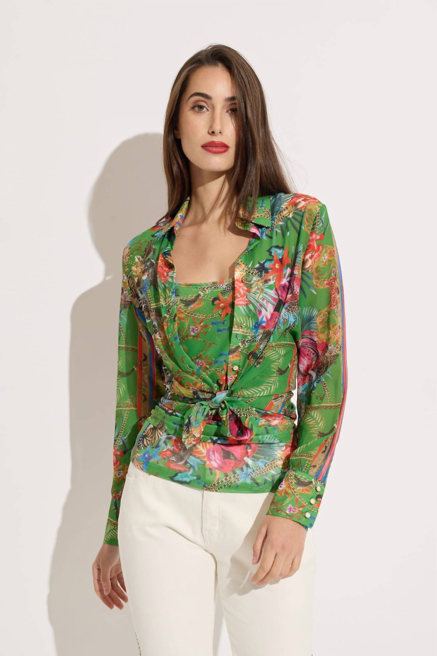 Perfectly tailored and soft to the touch. Experience the Oolala Jungle Print Chiffon Button Down Blouse, designed for chic vacation style. This women's blouse features long sleeves with buttoned cuffs and a collared neckline, providing a polished bohemian look. Crafted from lightweight 100% polyester, it offers a sheer, flowy fit with a matching printed camisole underneath. The front button closure ensures easy wear, and it is best maintained through hand washing. Perfect for embracing the boho chic trend in spring settings.