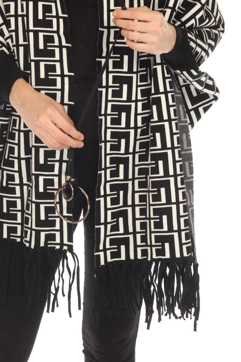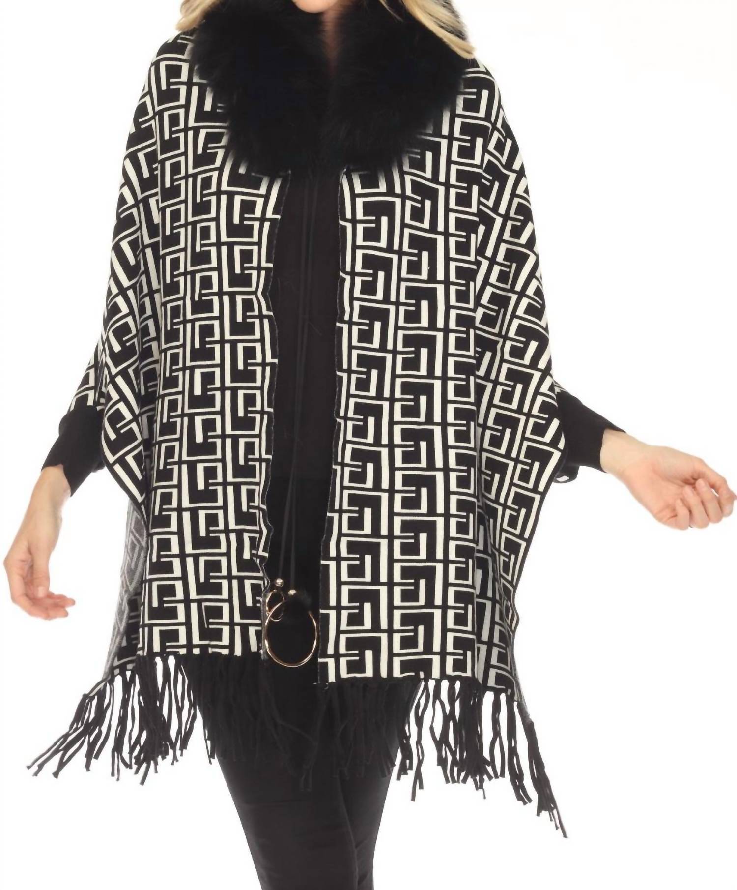 The coolest cape you ever did see. Elevate your style with the OO LA LA Meander Pattern Real Fur Collar Fringe Cape in sophisticated black and white. This winter-ready cape, featuring long sleeves, is crafted from a cozy blend of 51% Viscose, 27% Nylon, and 22% Polyester. Its mid-thigh length pairs perfectly with a removable real fur collar and a chic fringe trim, while the front tie closure with a metal ring adds a touch of elegance. Made in China, this patterned standout is designed for a maximalist vacation look and requires professional dry cleaning for care. Back length measures 30.5 inches.